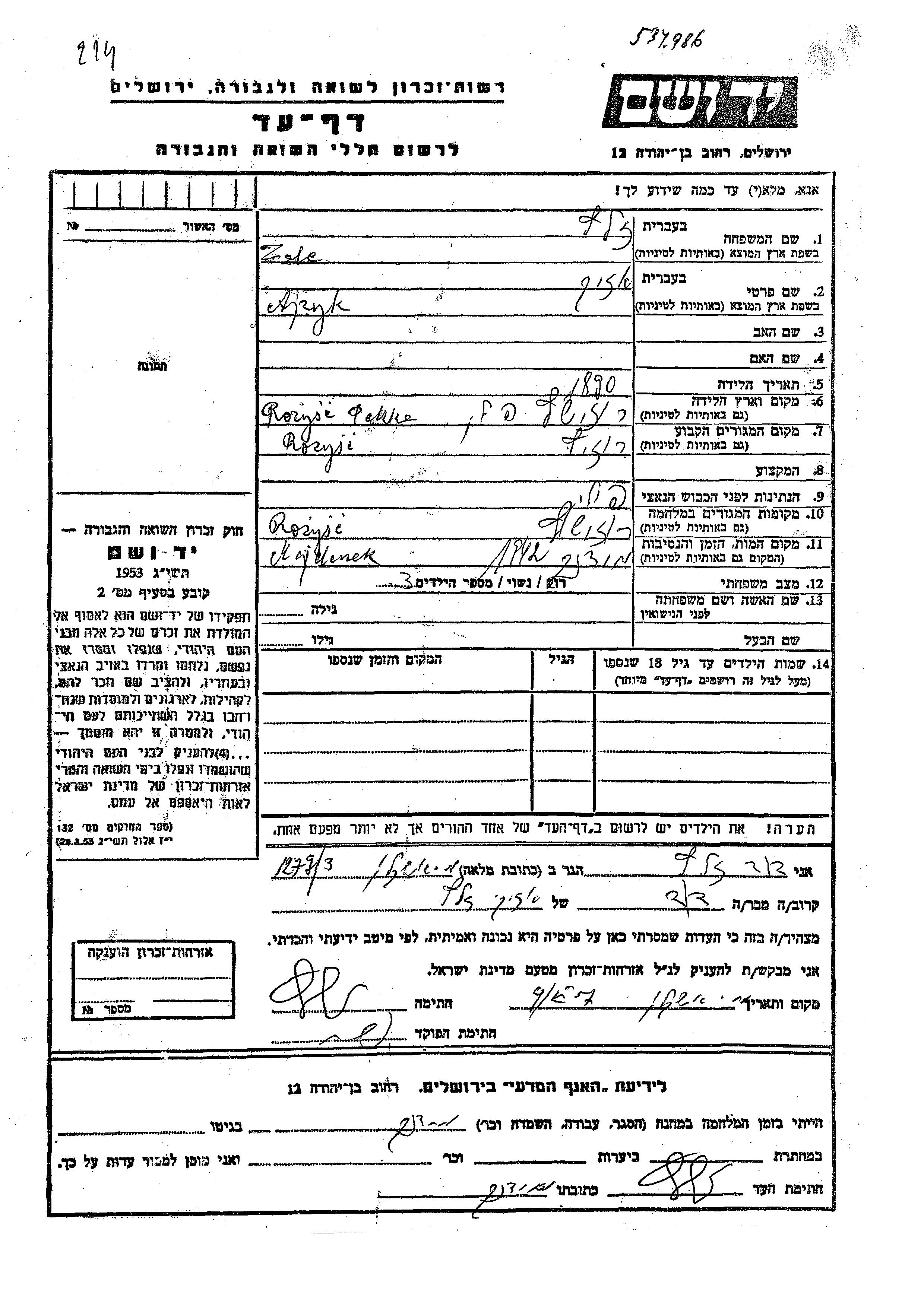 Zalc Ajzyk 1890 Rozyszcze, Pologne Feuille de témoignage
