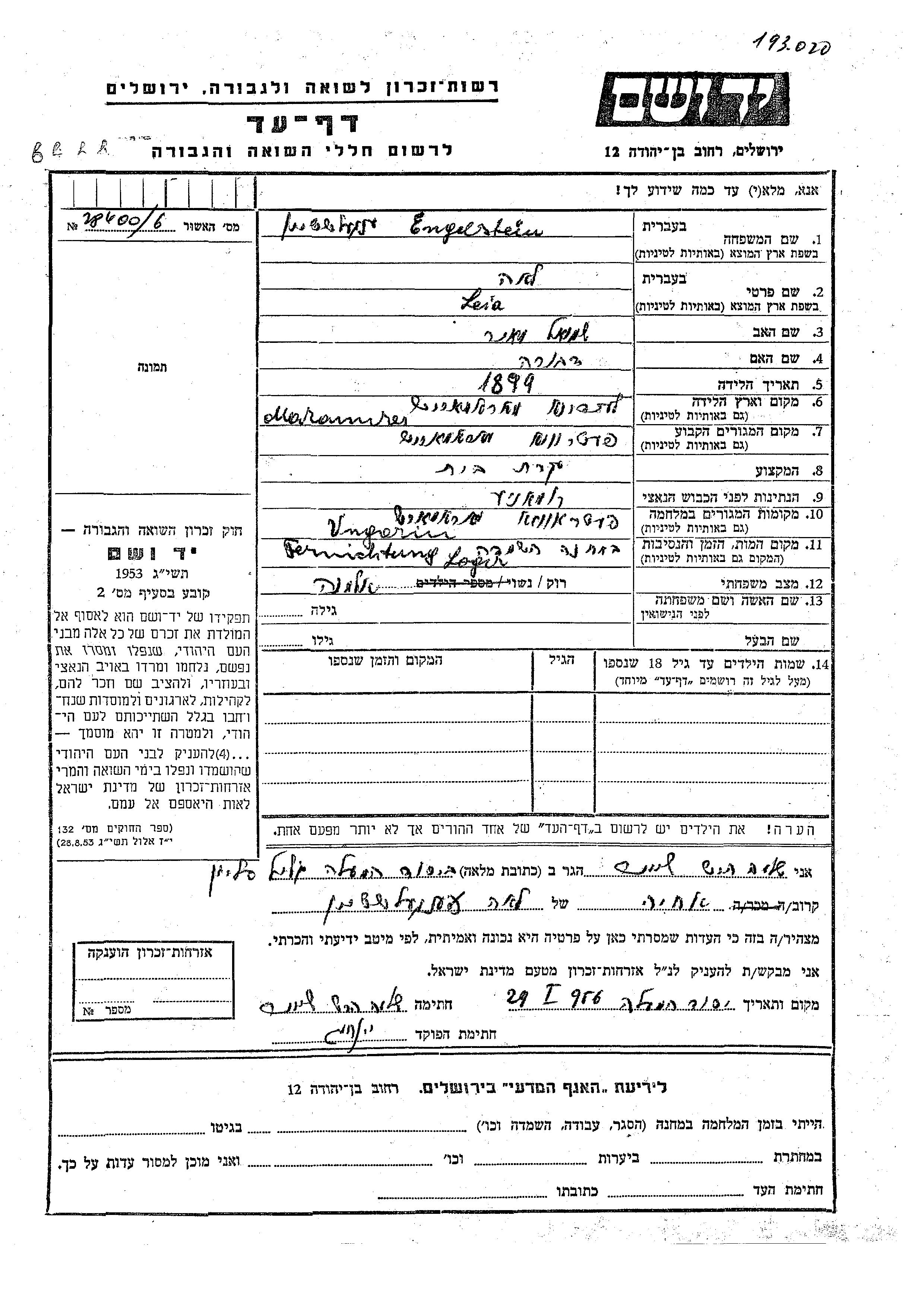 Yad Vashem - Pages of Testimony Names Memorial Collection