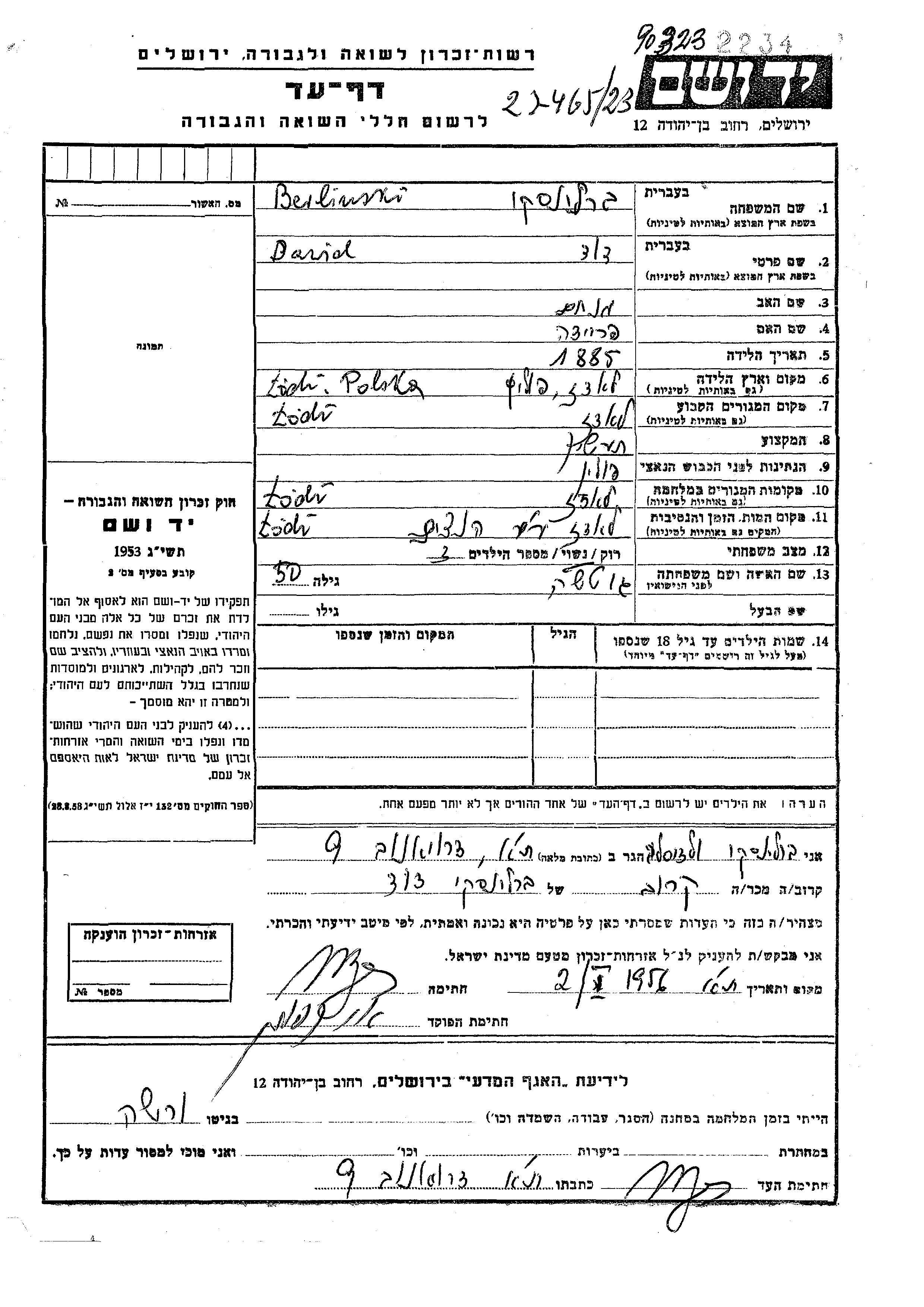 Berlinski Dawid 1885 Lodz, Pologne Feuille de témoignage