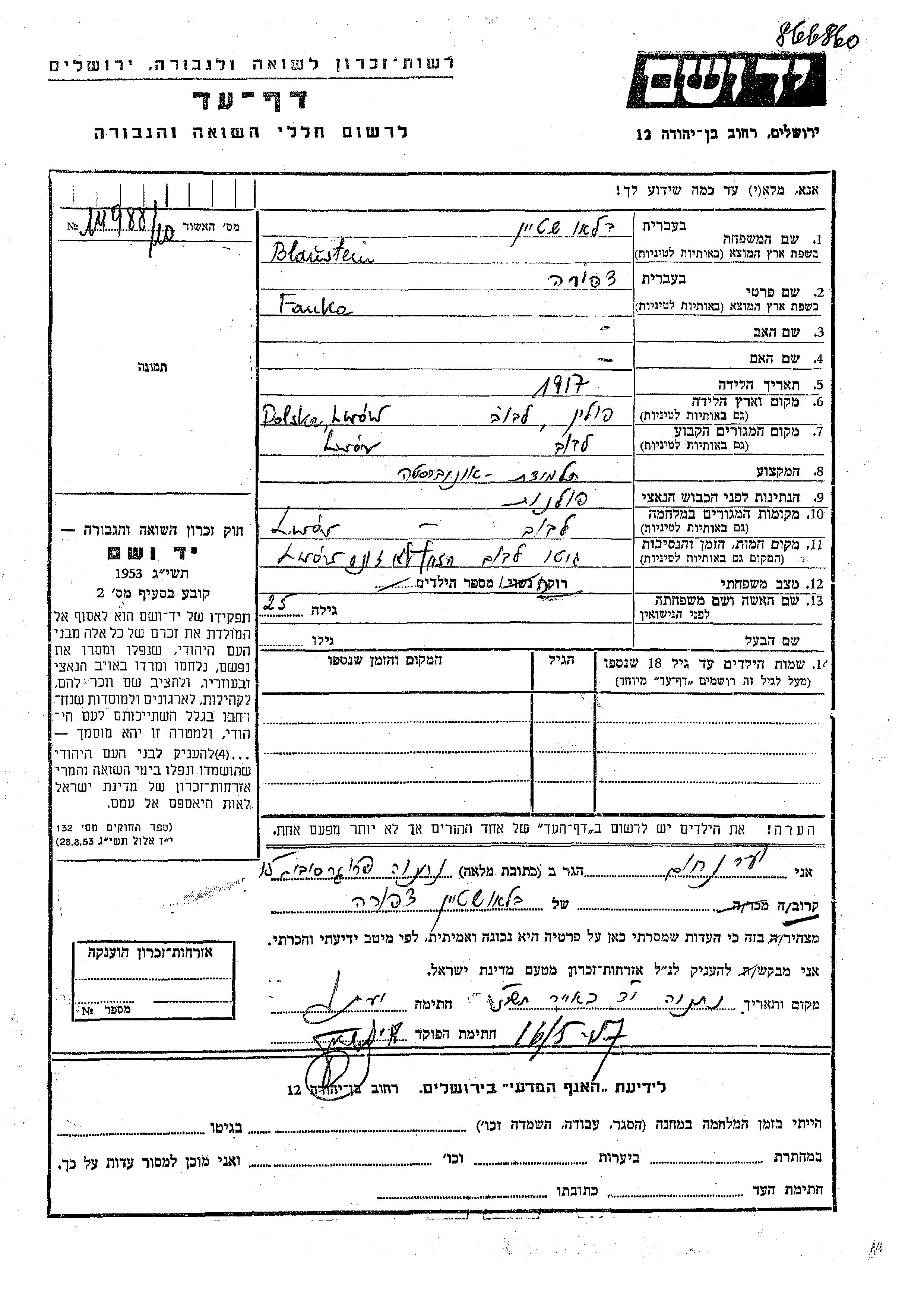 Blaustein Fanka Tzipora 1917 Lwow, Pologne Feuille de témoignage
