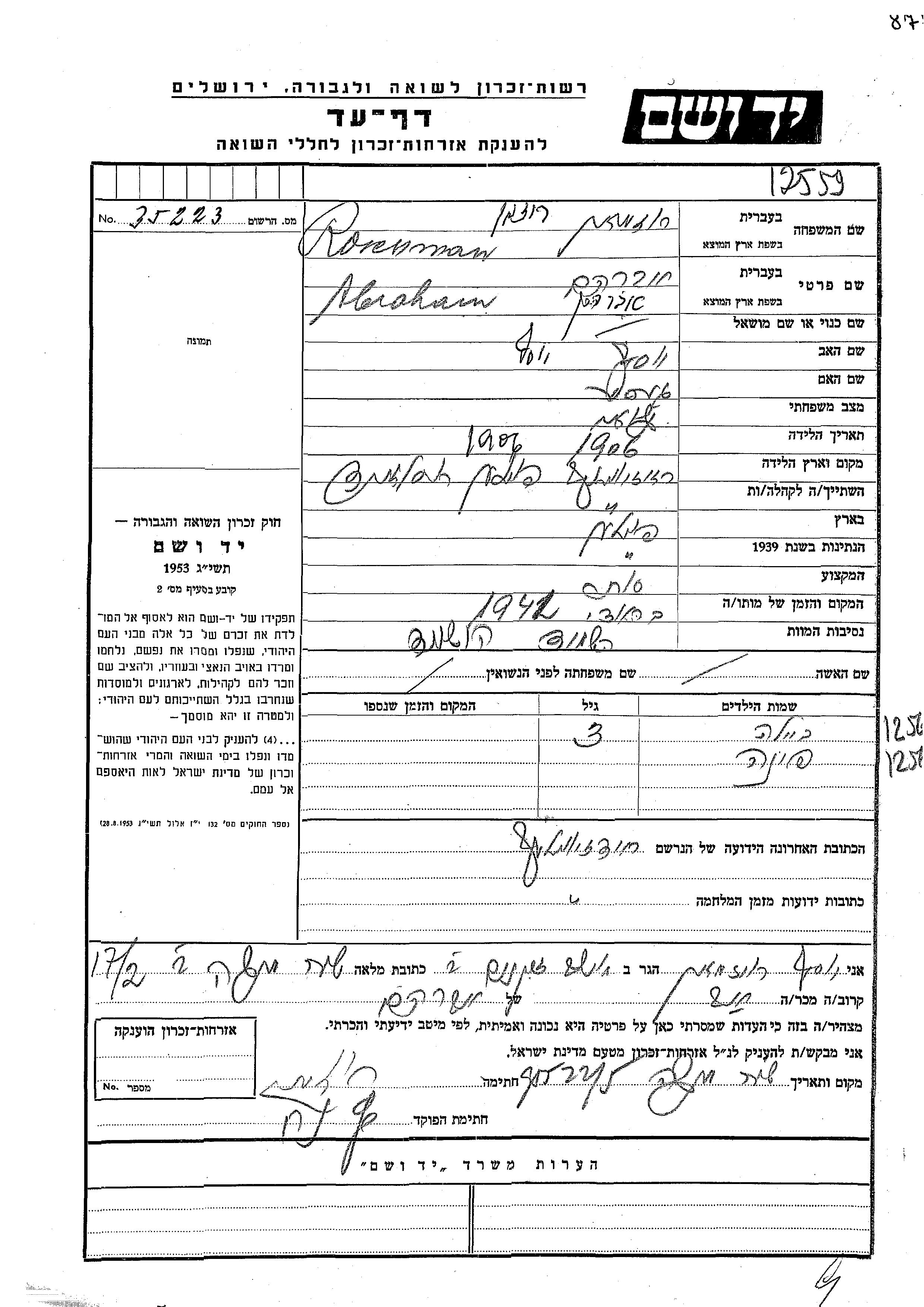 Rosenman Rozman Abraham 1906 Radziwillow, Pologne Feuille de témoignage