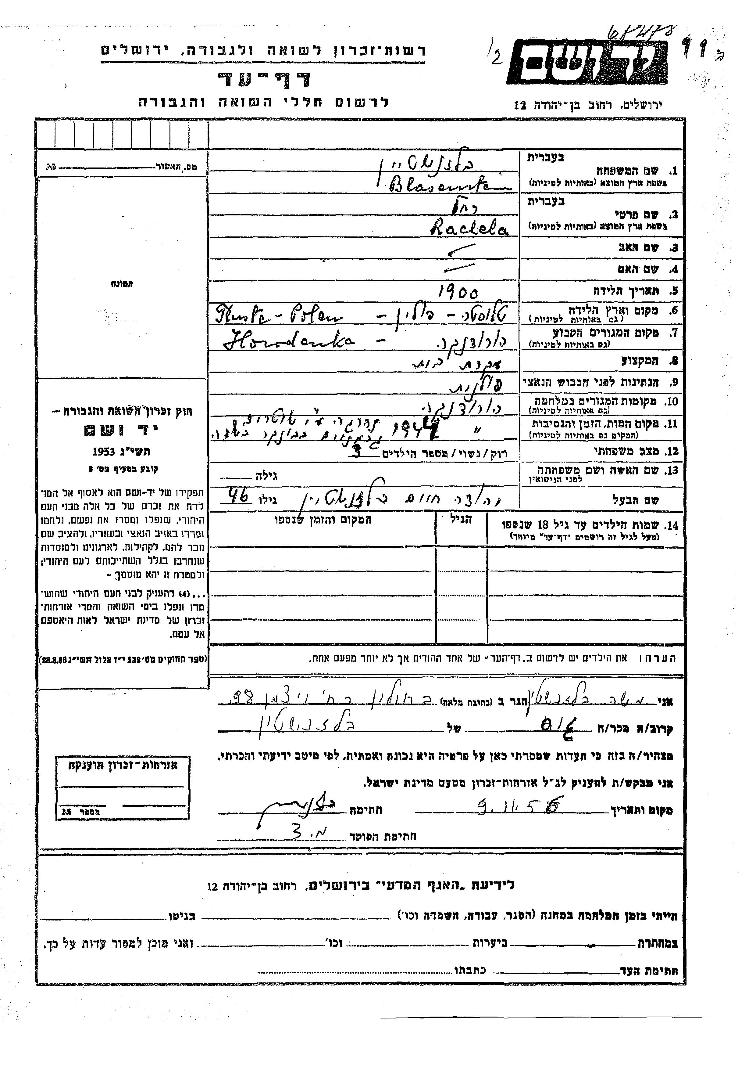Blasenstein Rachela 1900 Horodenka, Pologne Feuille de témoignage