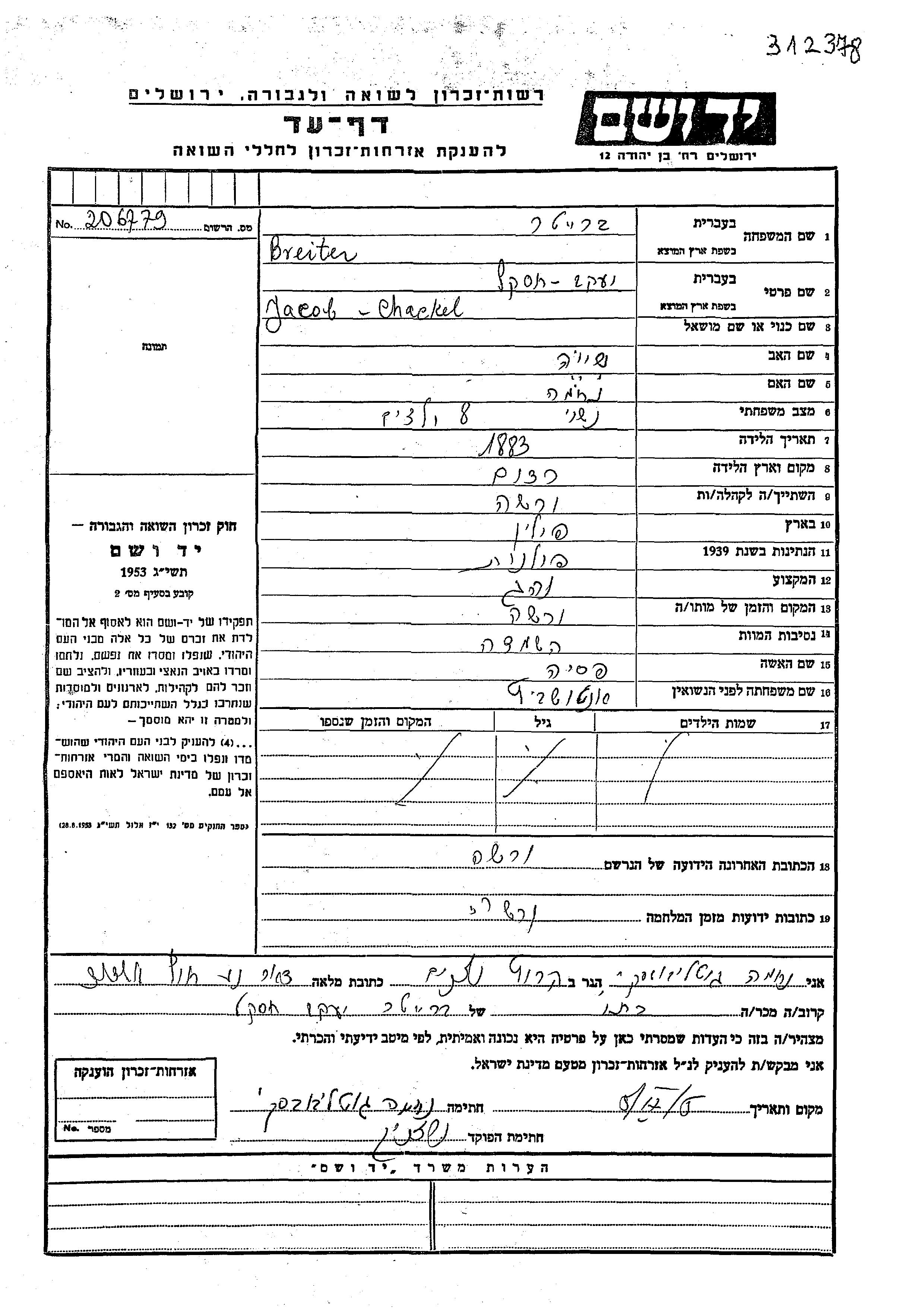 Jakob Chackel Breiter est né à Radom, Pologne en 1883, fils de Sheya et de Nekhama. Il était Chauffeur et Mariée à Pesia née Antoshevitz. Avant la seconde guerre mondiale il vivait à Warsaw, Pologne. Au cours de la guerre, il était à Warsaw, Pologne.