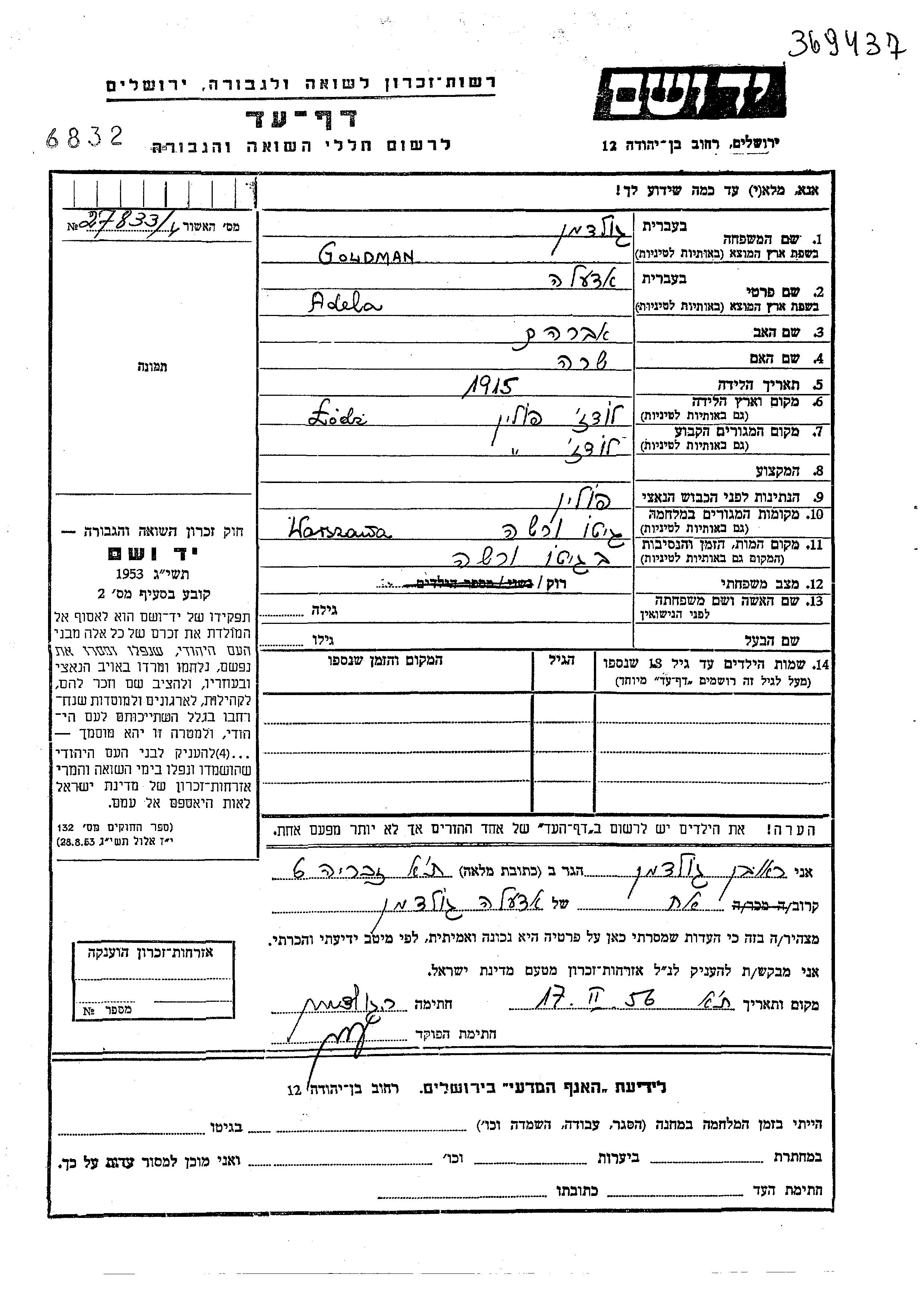 Goldman Adela 1915 Lodz, Pologne Feuille de témoignage