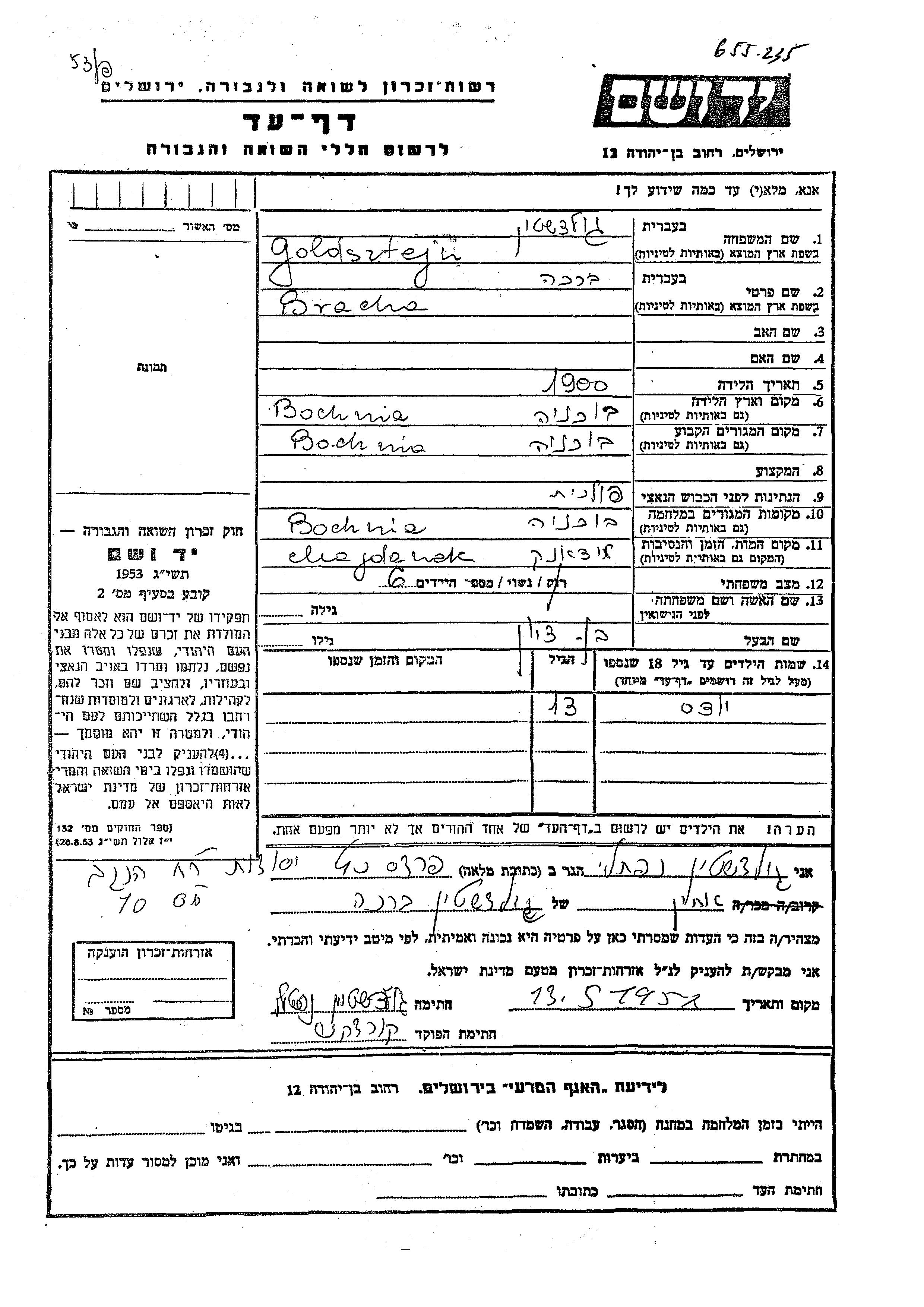 Goldsztein Bracha 1900 Bochnia, Pologne Feuille de témoignage
