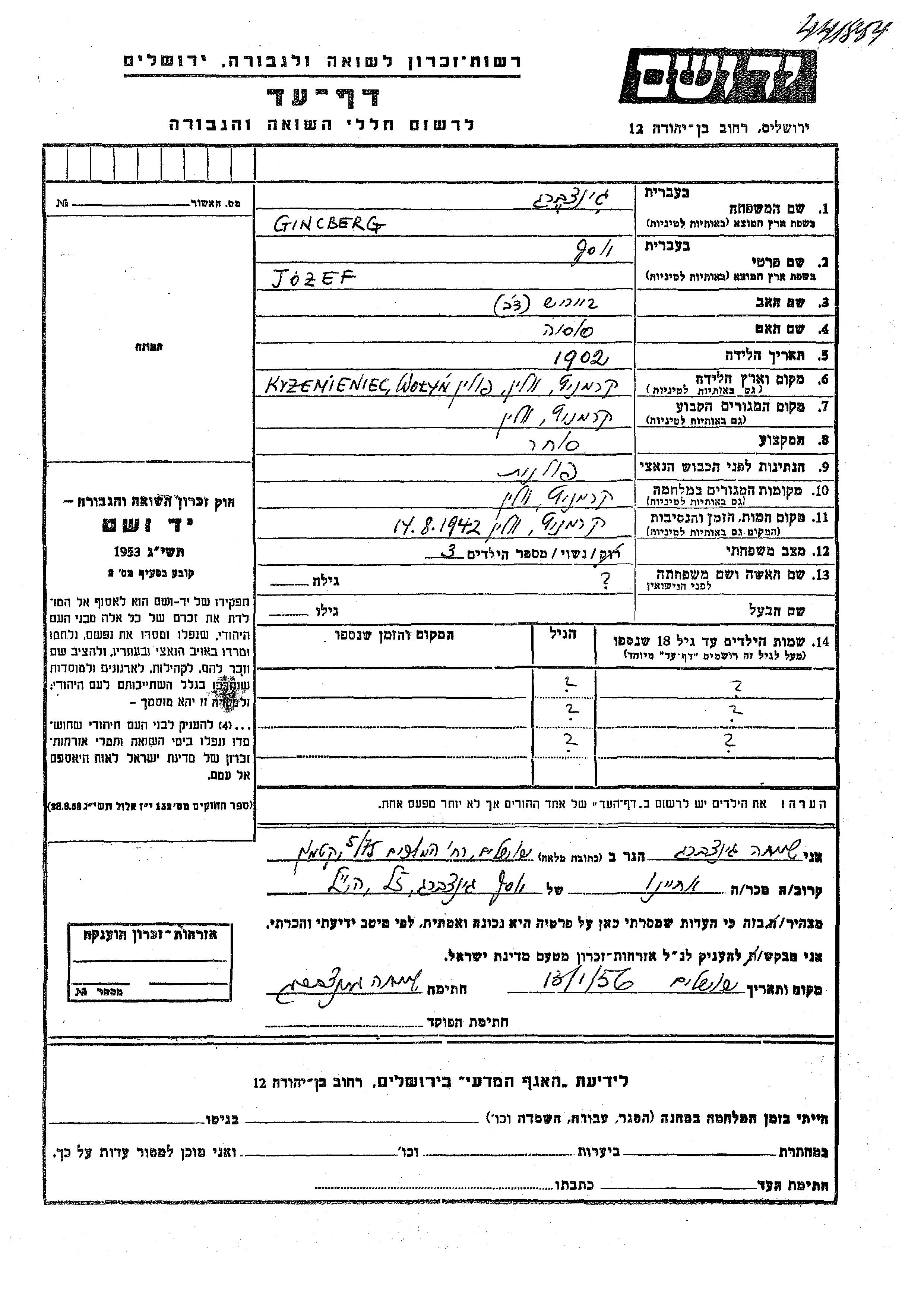 Gincberg Jozef 1902 Krzemieniec, Pologne Feuille de témoignage