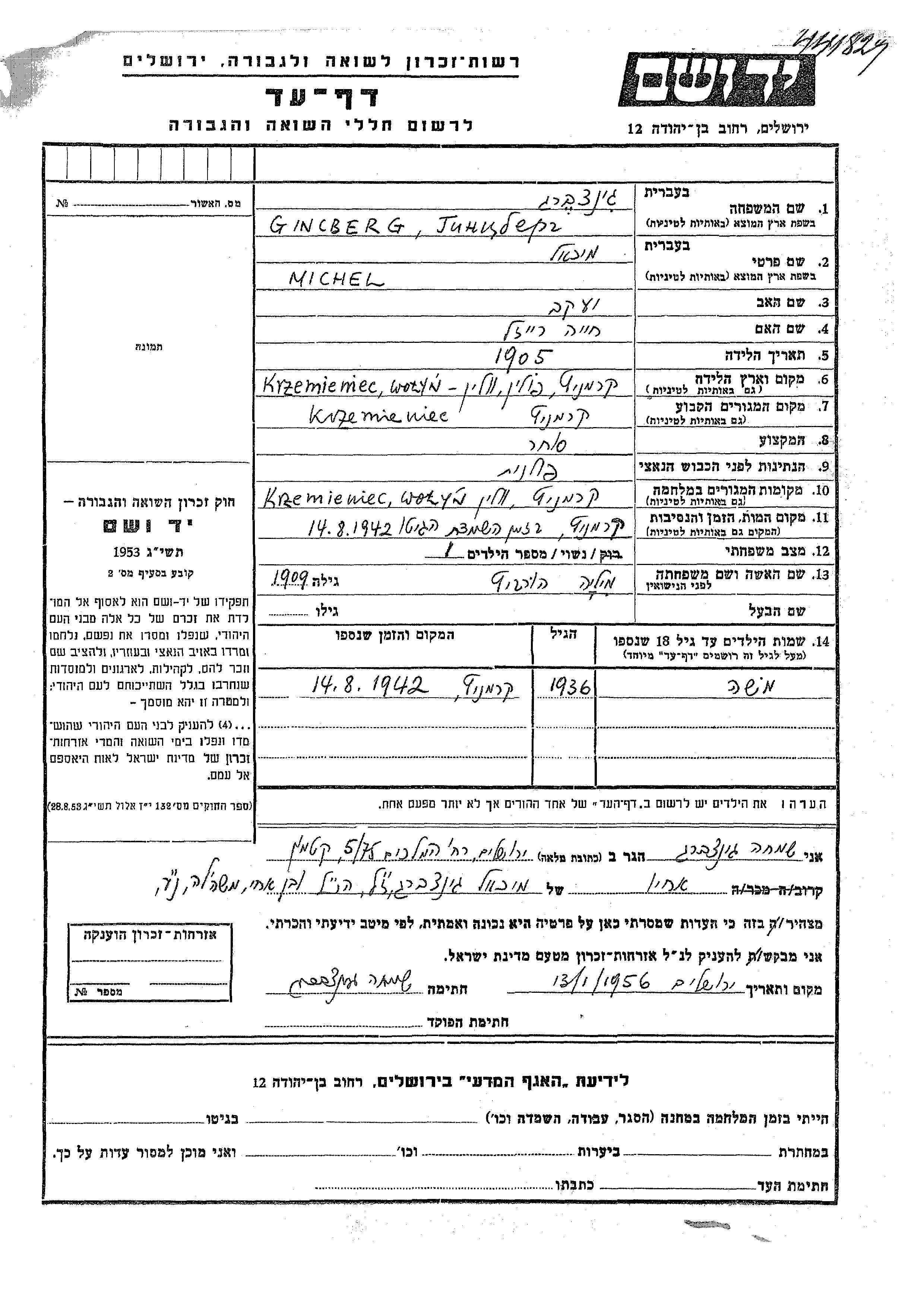 Gincberg Michel 1905 Krzemieniec, Pologne Feuille de témoignage
