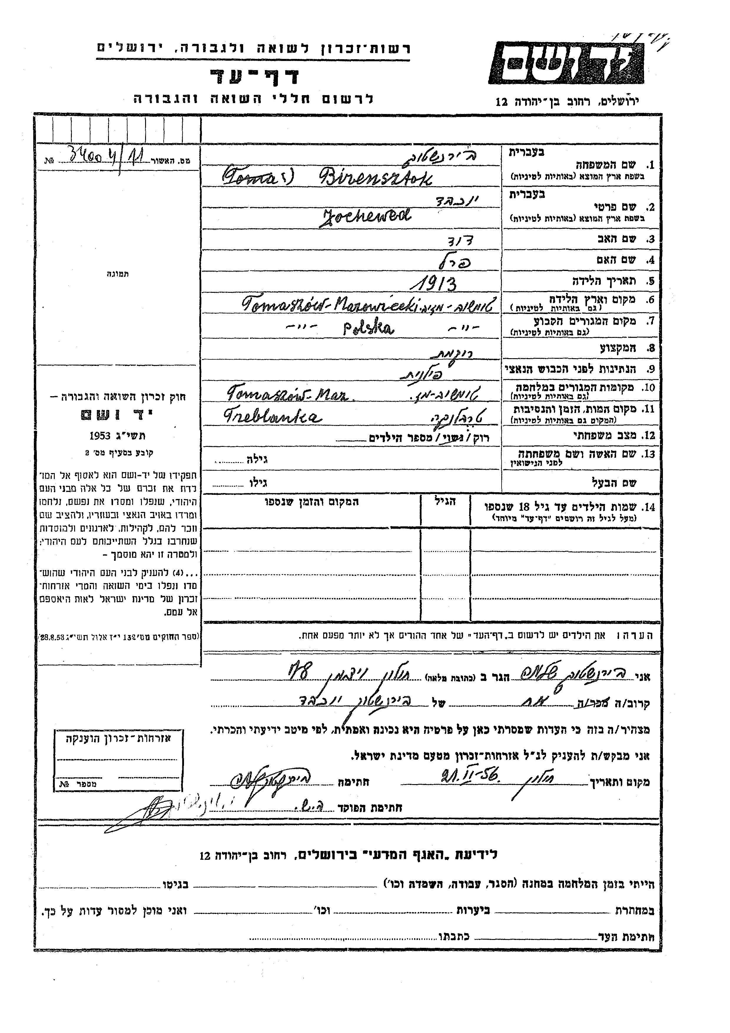 Birensztok Yochewed 1913 Tomaszow Mazowieckie, Pologne Feuille de témoignage