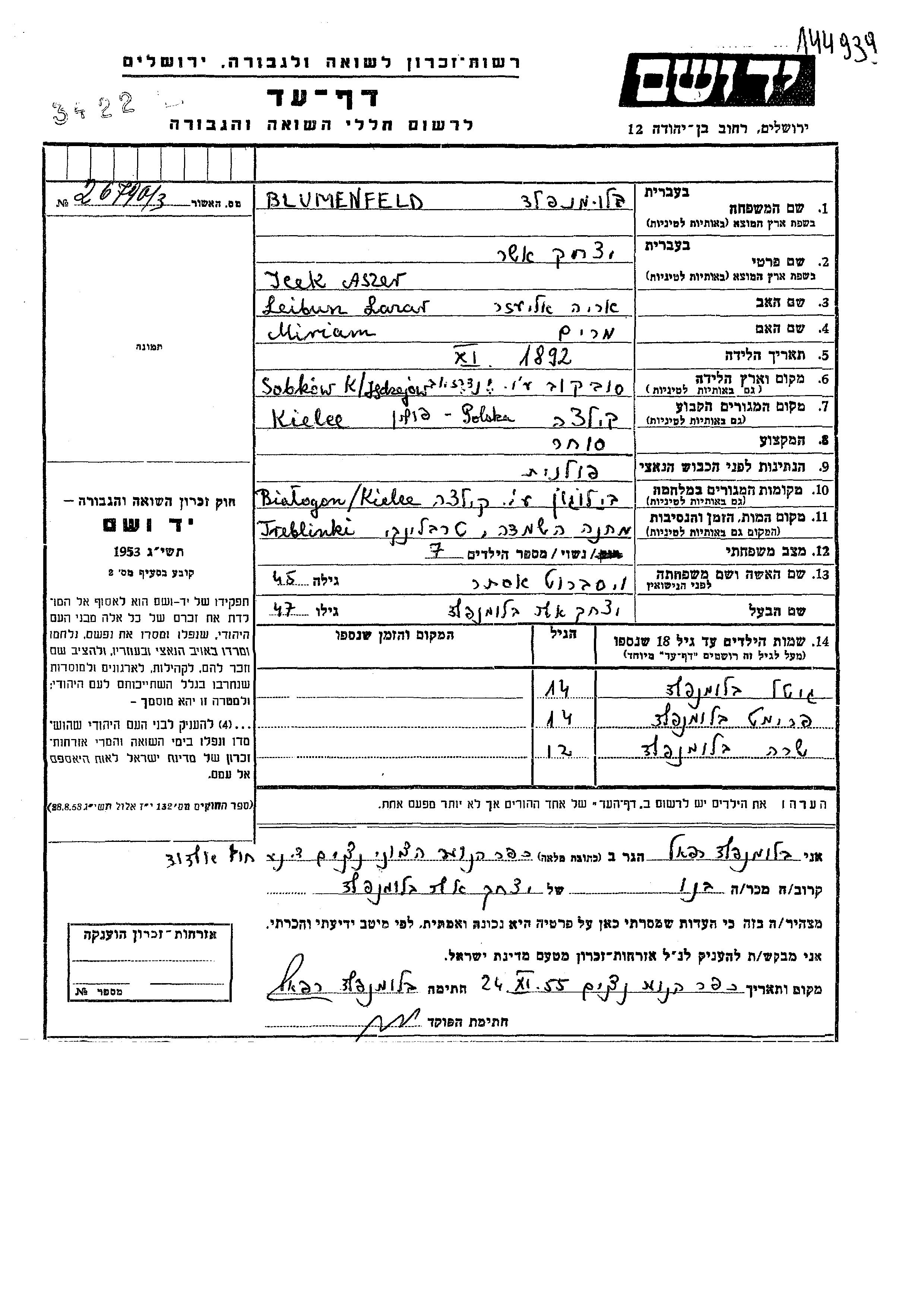 Blumenfeld Icek Aszer 1892 Kielce, Pologne Feuille de témoignage