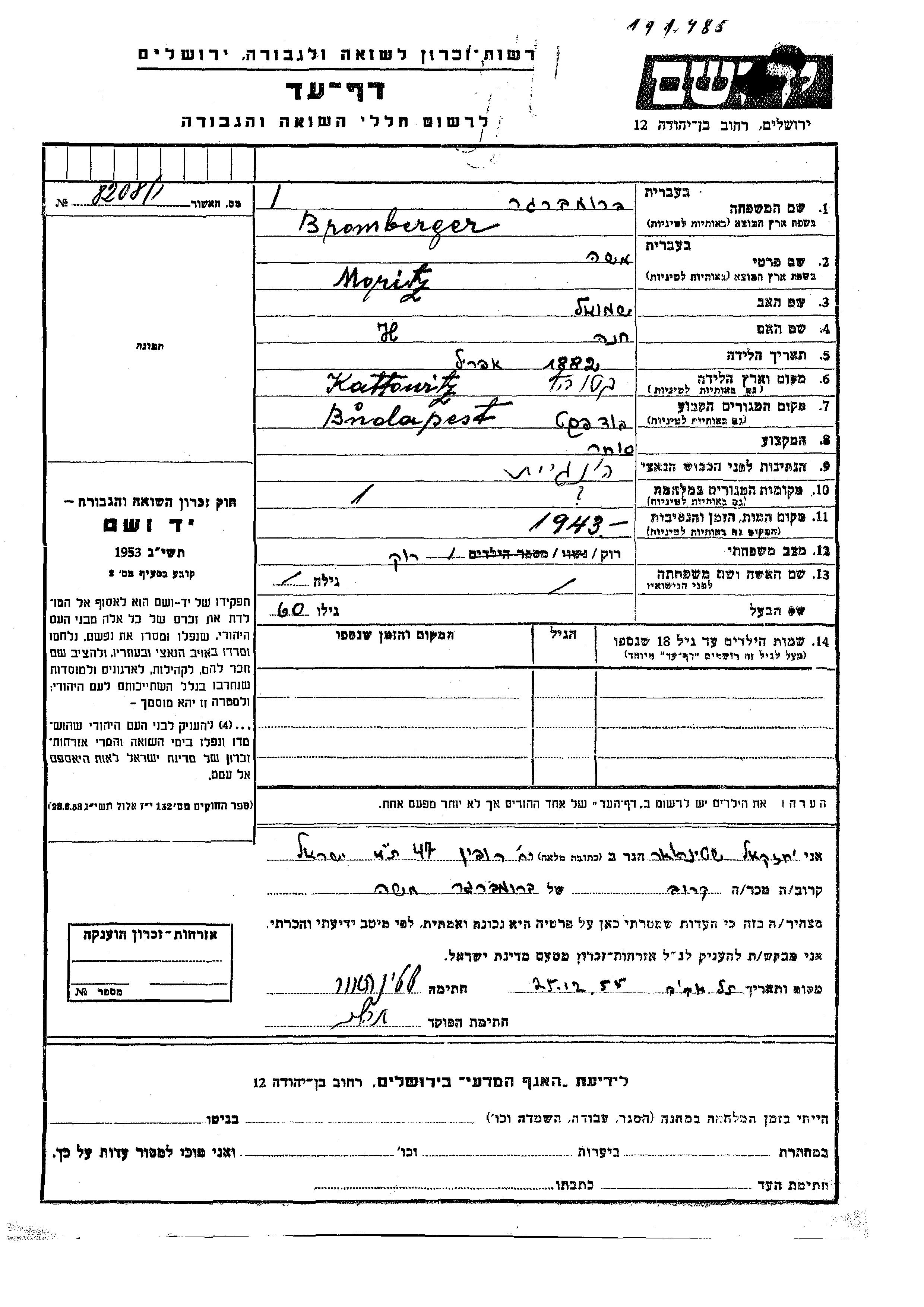Moritz Moshe Bromberger est né à Kattowitz, Pologne en 1882, fils de Shmuel et de Khana. Il était Commerçant/e et Célibataire. Avant la seconde guerre mondiale il vivait à Budapest, Hongrie.