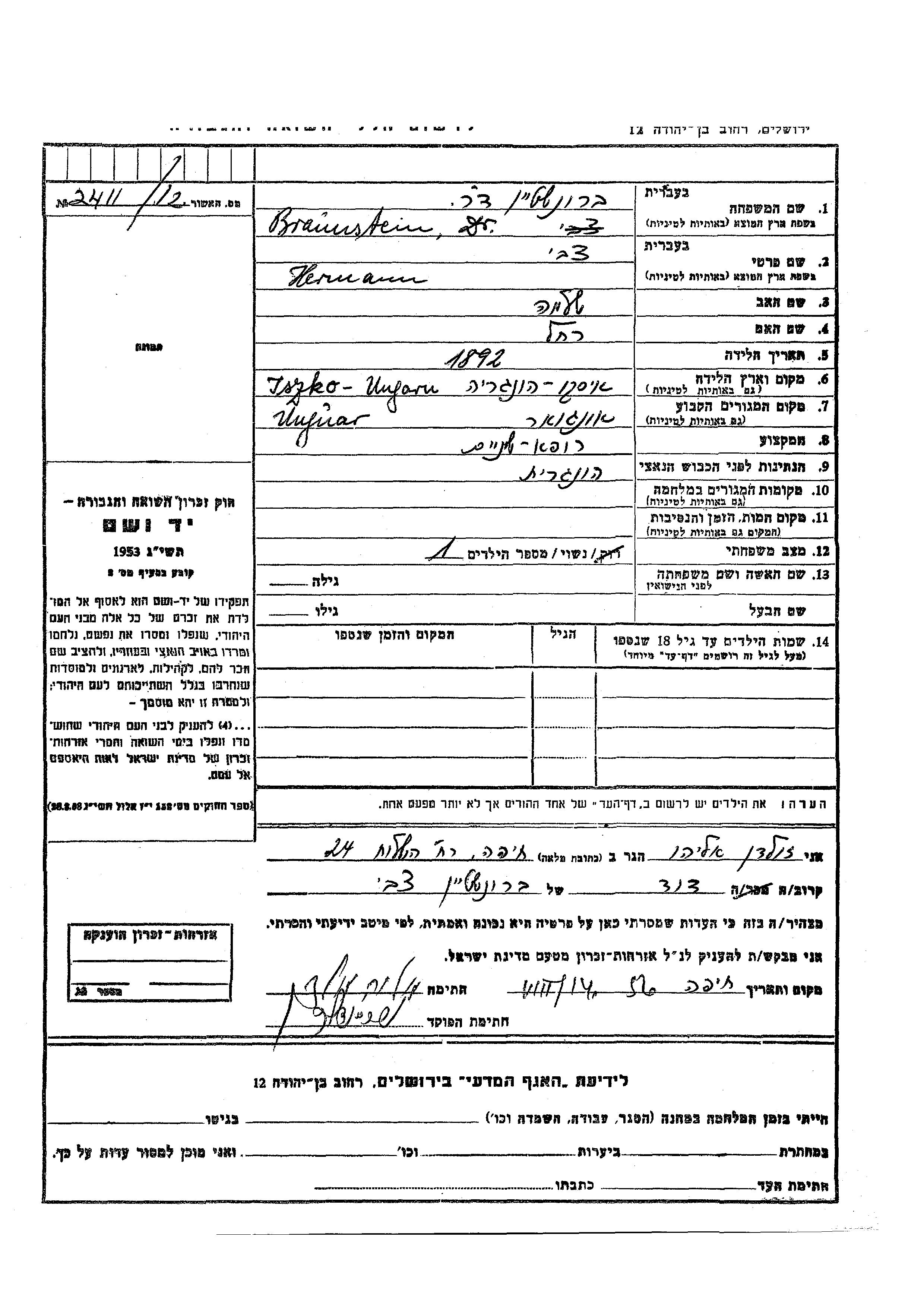 Bronstein Herman Tzvi 1892 Ungvar, Tchécoslovaquie Feuille de témoignage