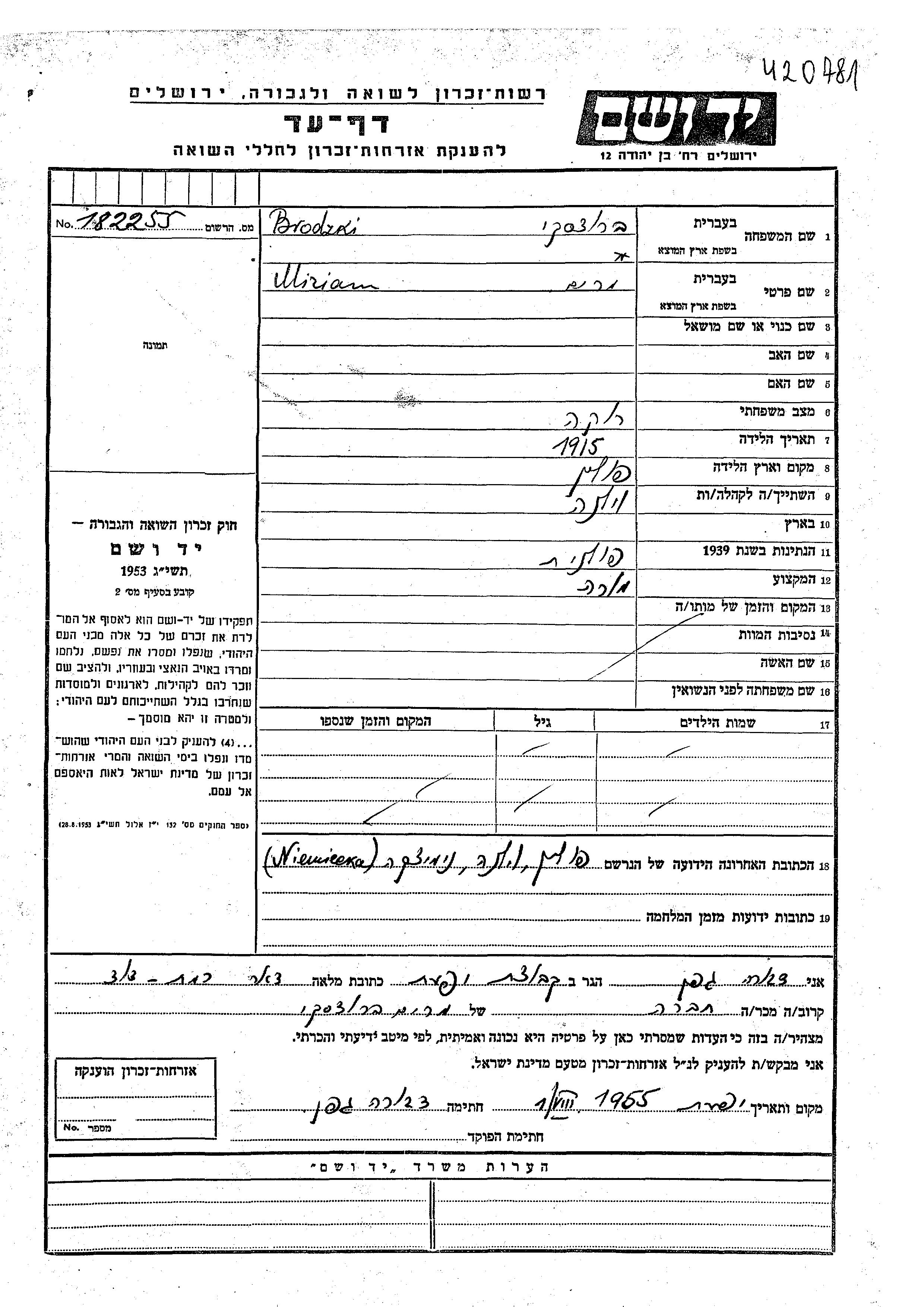 Brodzki Miriam 1915 Vilnius, Pologne Feuille de témoignage