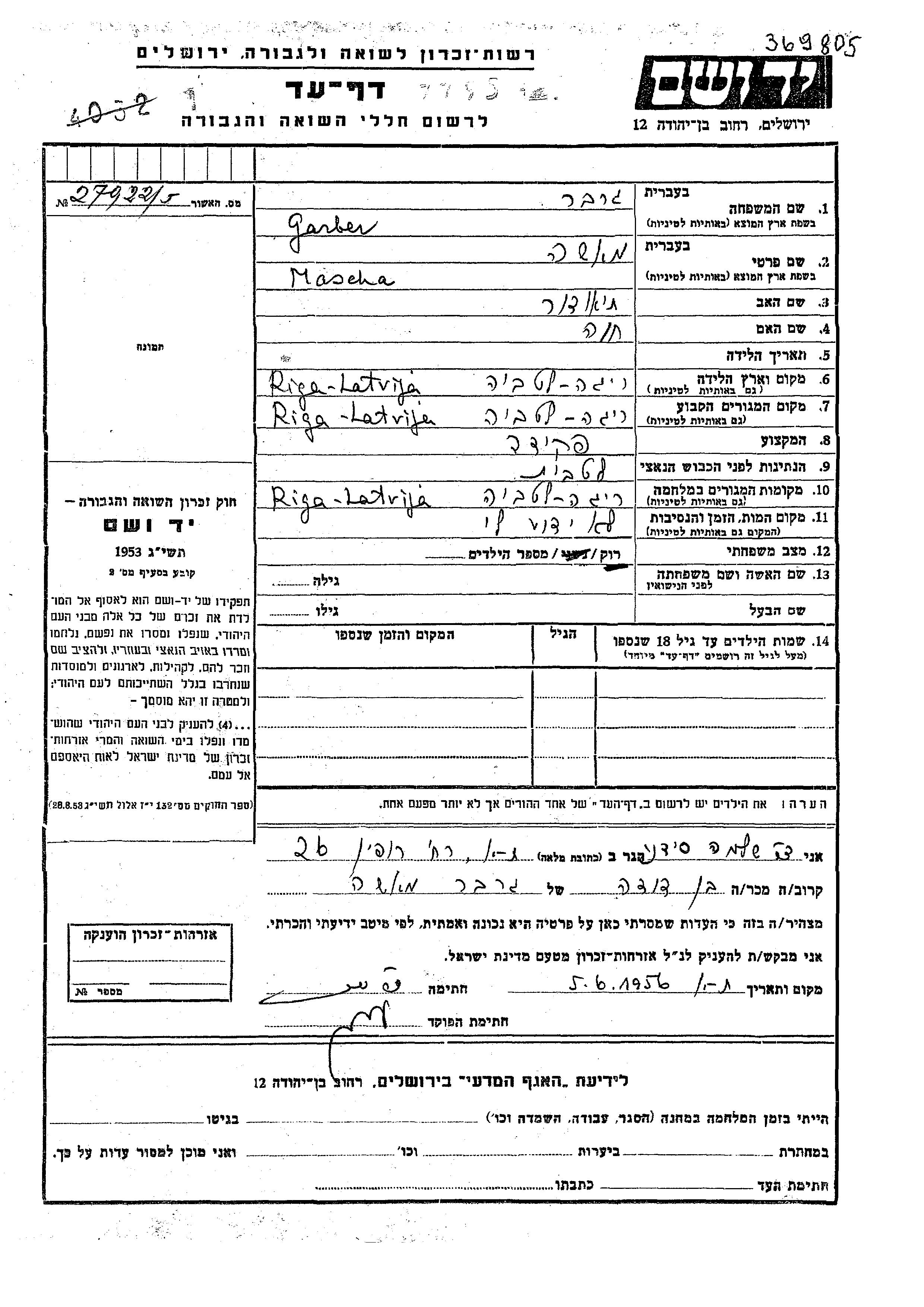 Gerber Graber Mascha Riga, Lettonie Feuille de témoignage