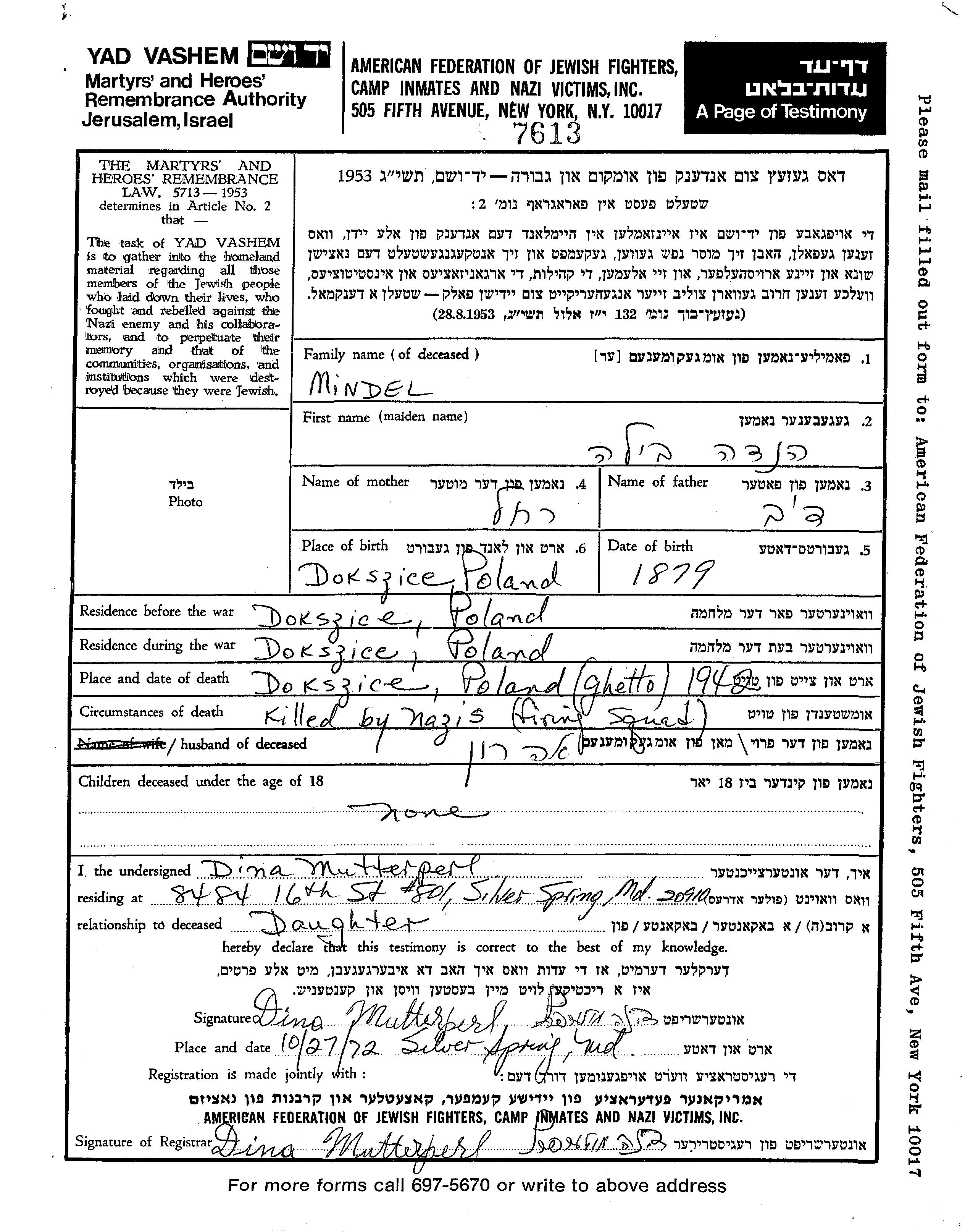 Mindel Hinda Bila 1879 Dokszyce, Pologne Feuille de témoignage