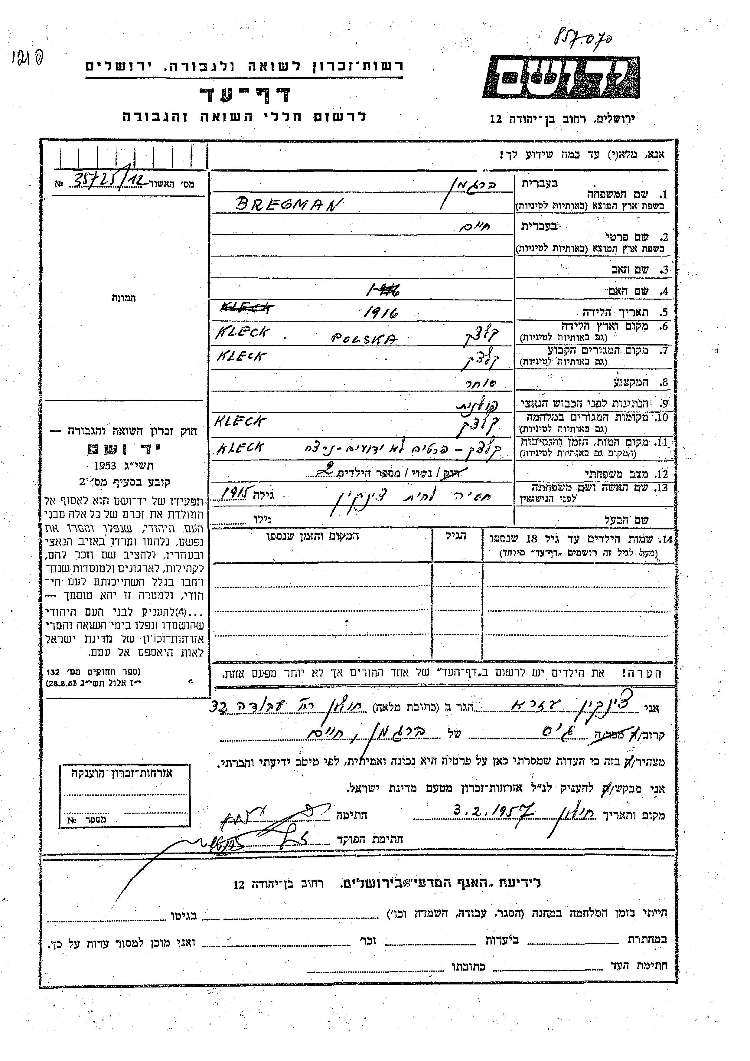 Bregman Bergman Khaim 1916 Kleck, Pologne Feuille de témoignage