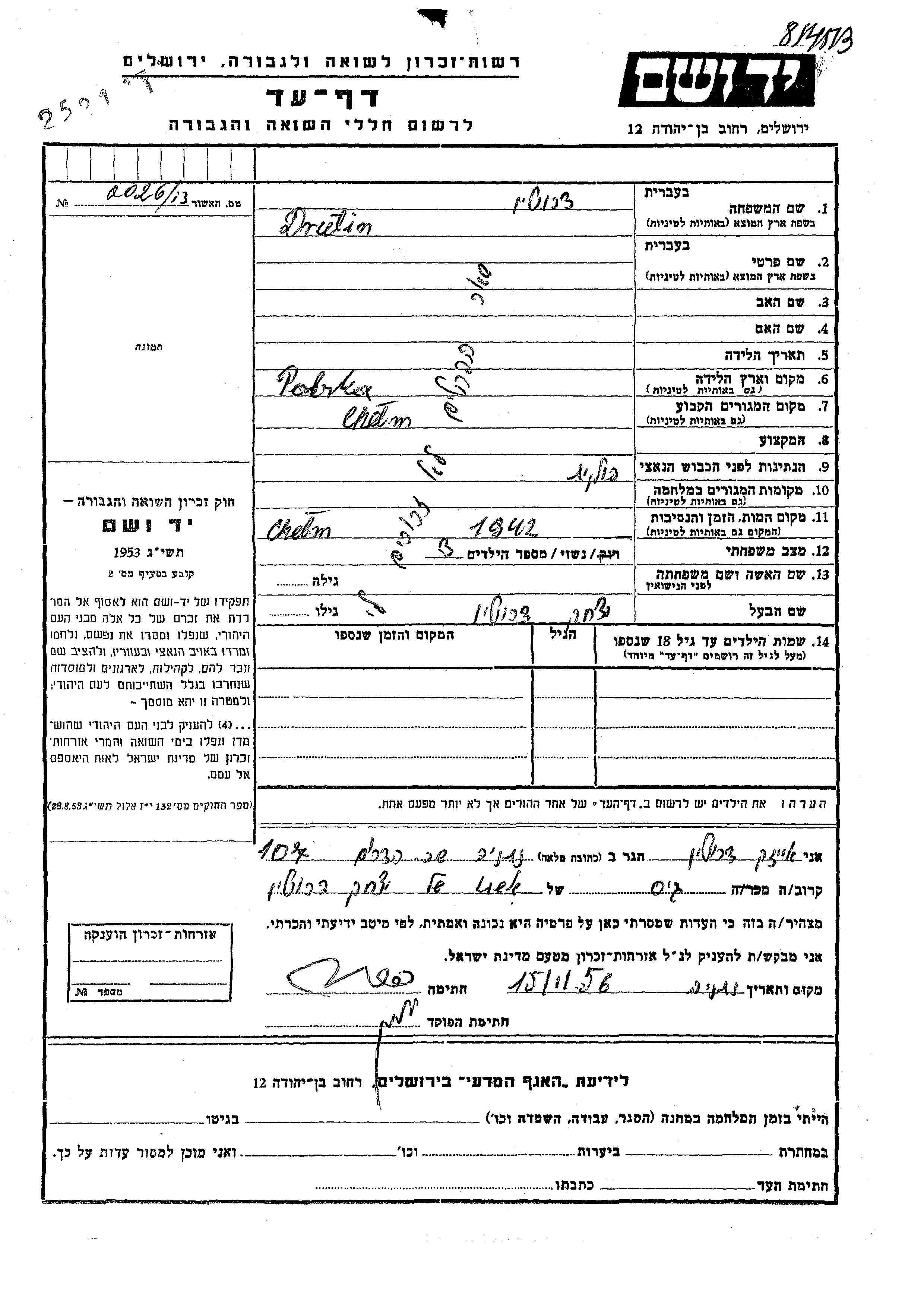 Drutin prénom inconnu Chelem, Pologne Feuille de témoignage