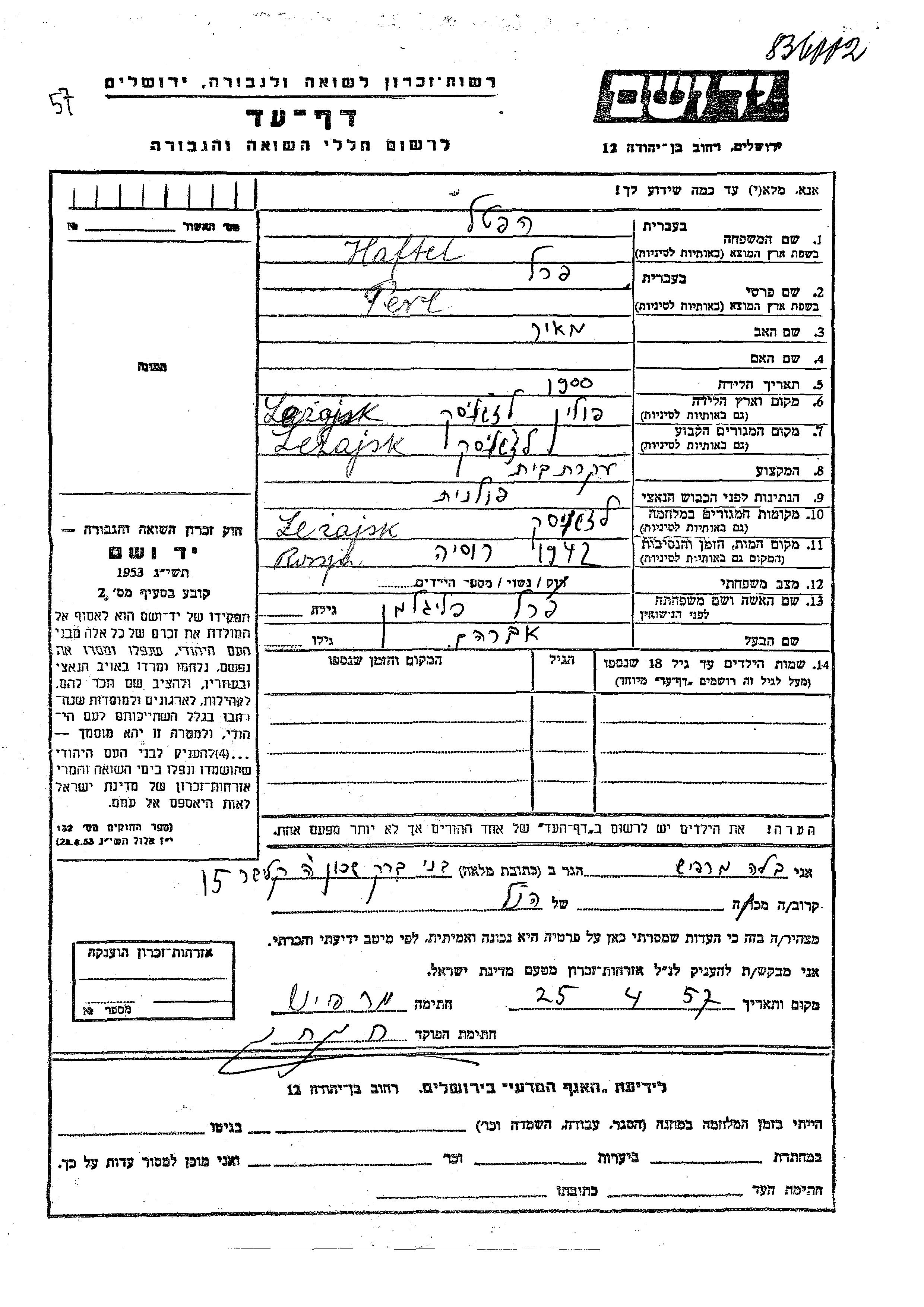 Haftel Perl 1900 Lezajsk, Pologne Feuille de témoignage