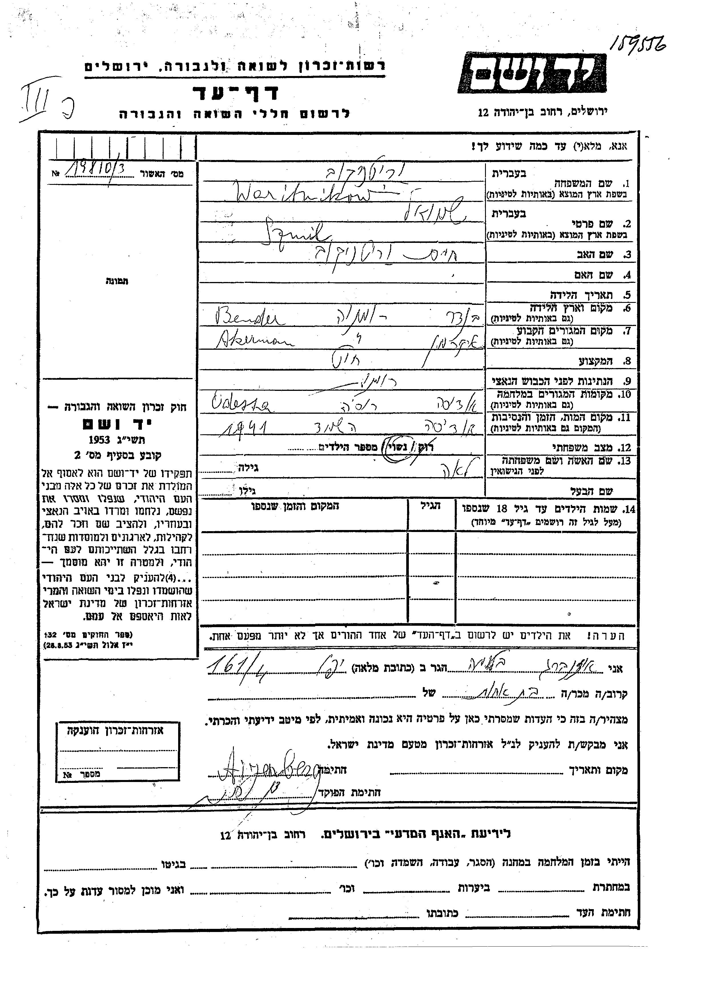 Waritnikow Szmil Akerman, Roumanie Feuille de témoignage