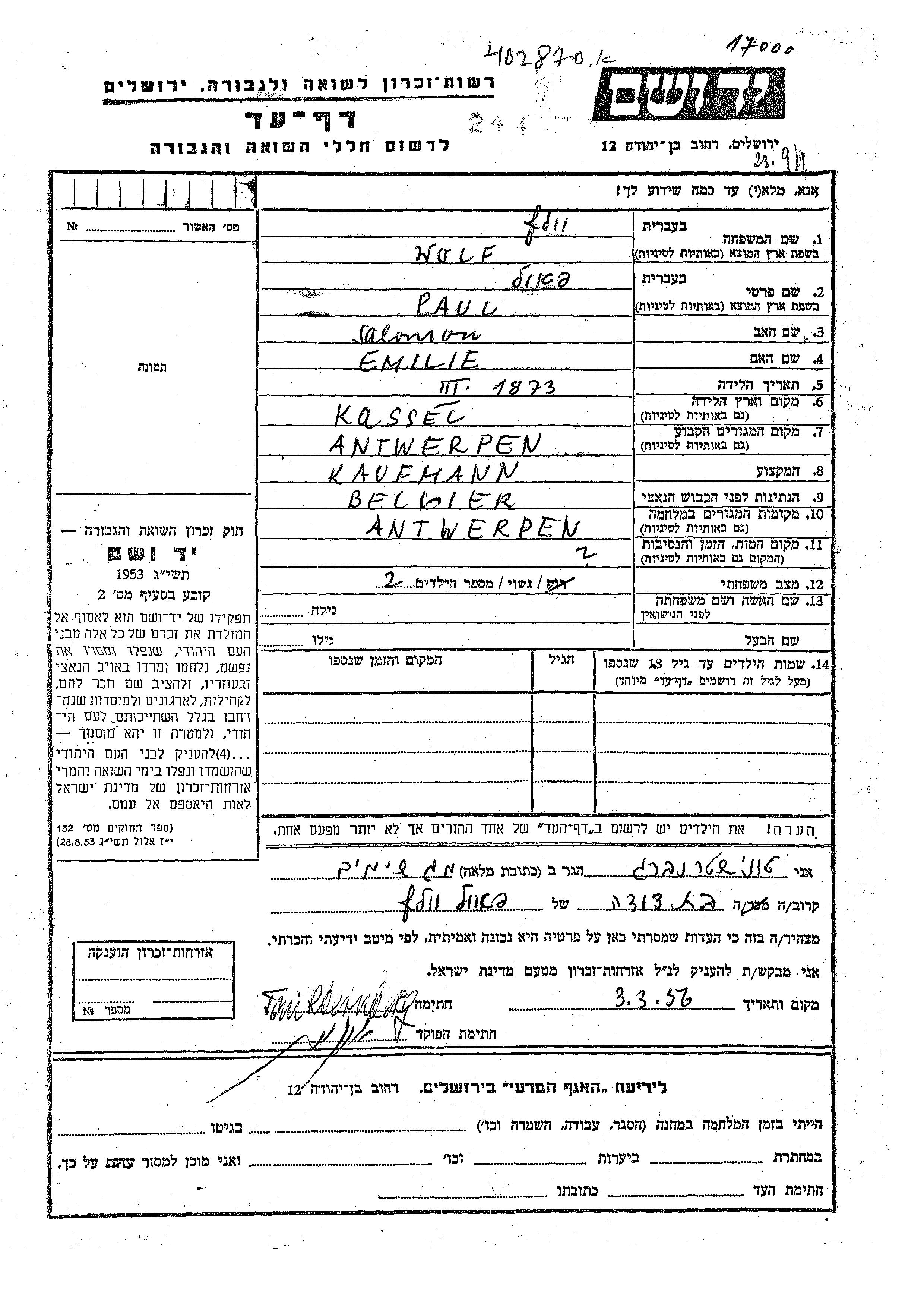 Wolf Paul 1873 Antwerpen, Belgique Feuille de témoignage
