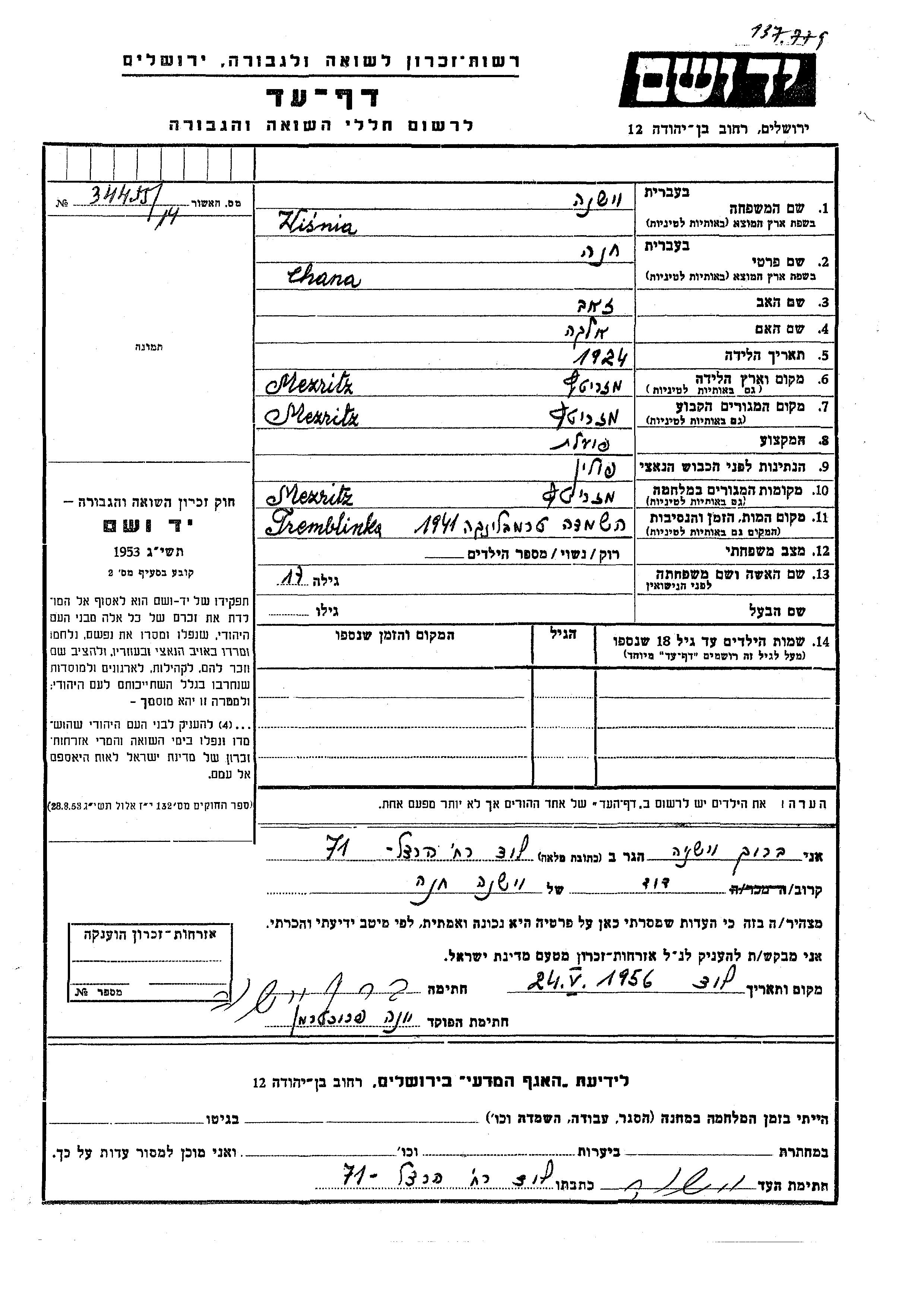 Chana Wisnia est née à Mezrich, Pologne en 1924, fille de Zeev et de Elka. Elle était Ouvrier/e. Avant la seconde guerre mondiale elle vivait à Mezrich, Pologne. Pendant la guerre, elle était à Mezrich, Pologne.