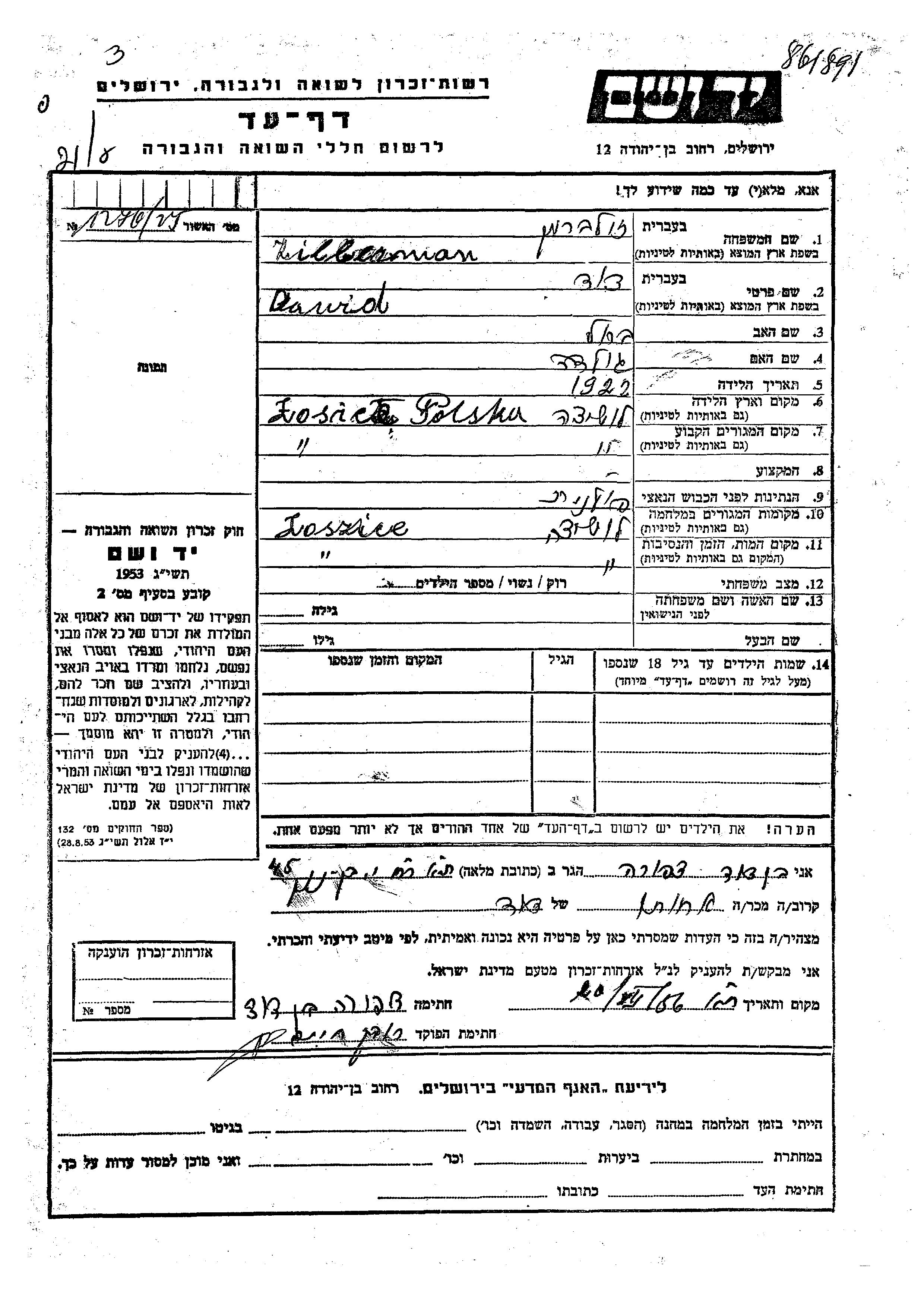 Dawid Zilberman est né à Loszice, Pologne en 1922, fils de Berul et de Golda. Avant la seconde guerre mondiale il vivait à Loszice, Pologne. Au cours de la guerre, il était à Loszice, Pologne.