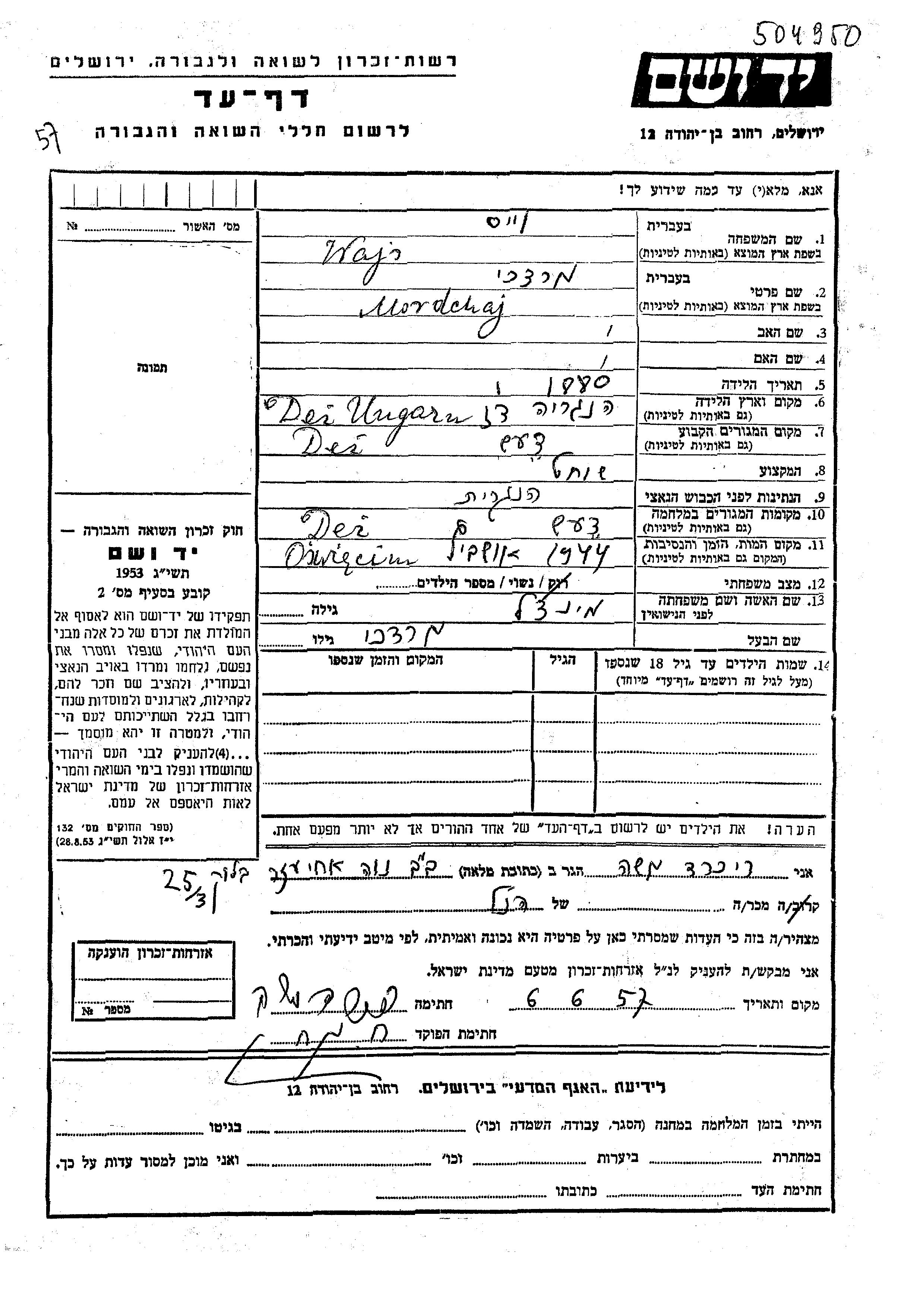Mordehaj a été assassiné pendant la Shoah. Lieu de la mort: Auschwitz, Pologne en 1944.