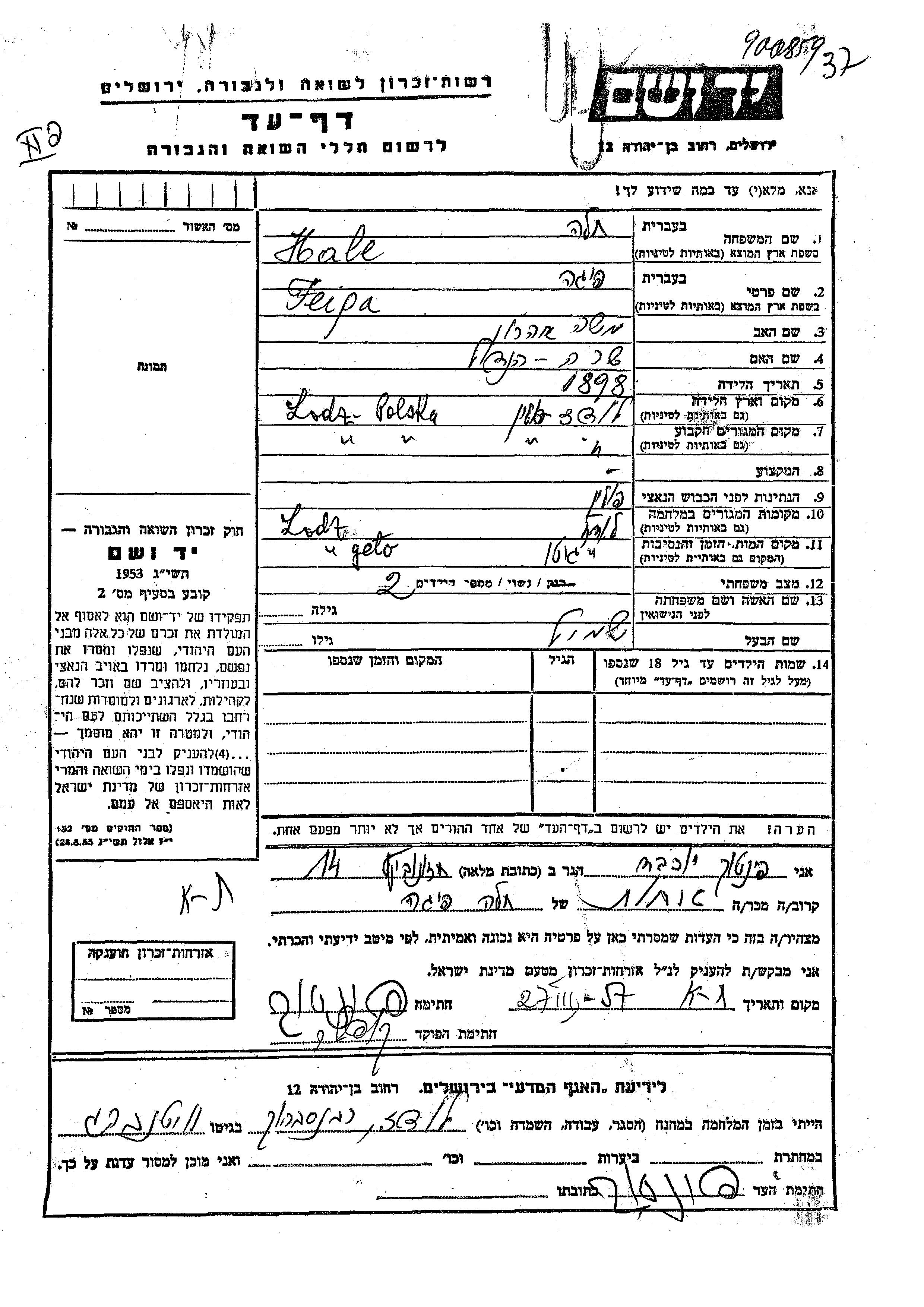 Hale Khala Feiga 1898 Lodz, Pologne Feuille de témoignage