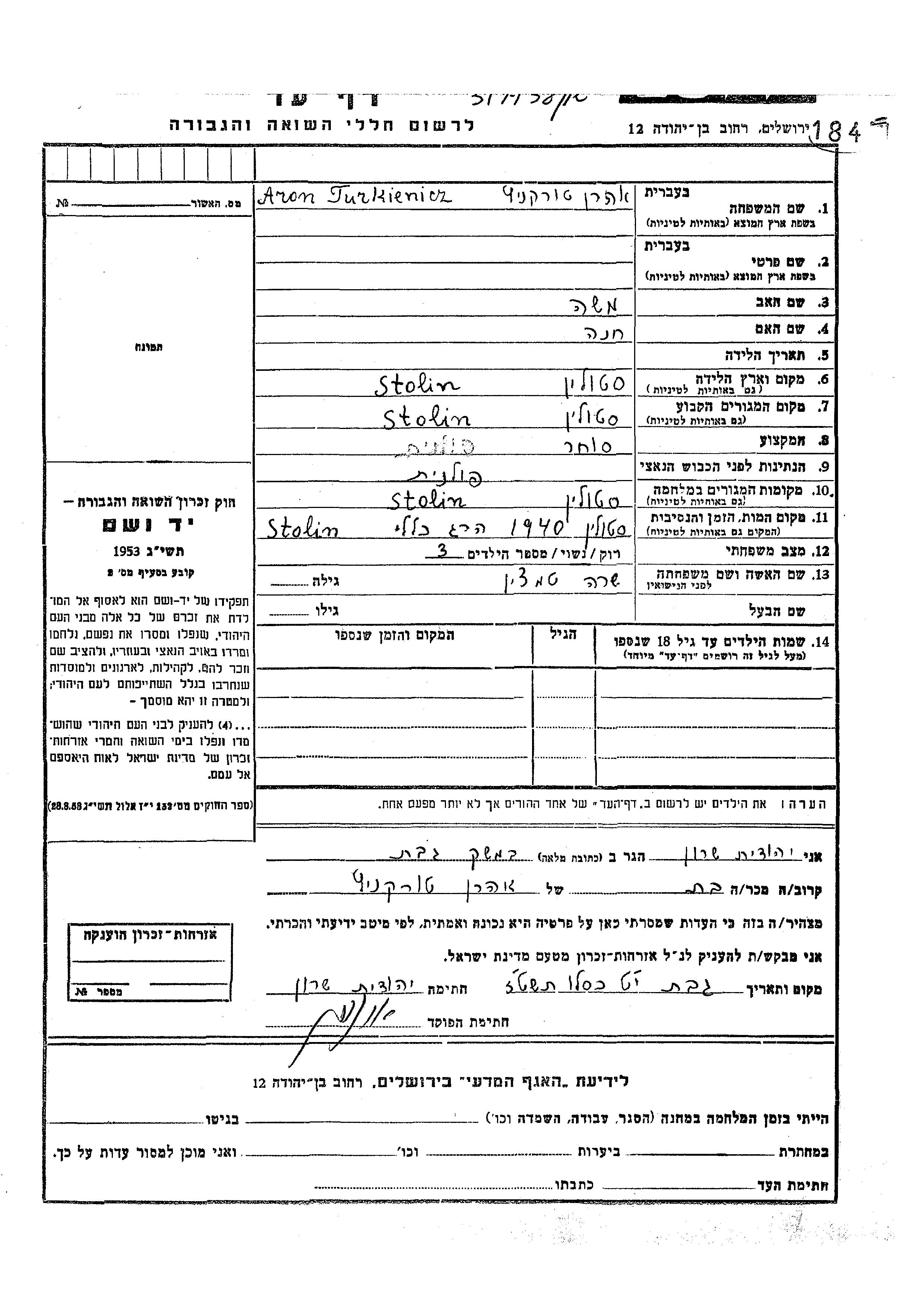 Aron Turkienicz est né à Stolin, Pologne, fils de Moshe et de Khana. Il était Commerçant/e et Mariée à Sara. Avant la seconde guerre mondiale il vivait à Stolin, Pologne. Au cours de la guerre, il était à Stolin, Pologne.