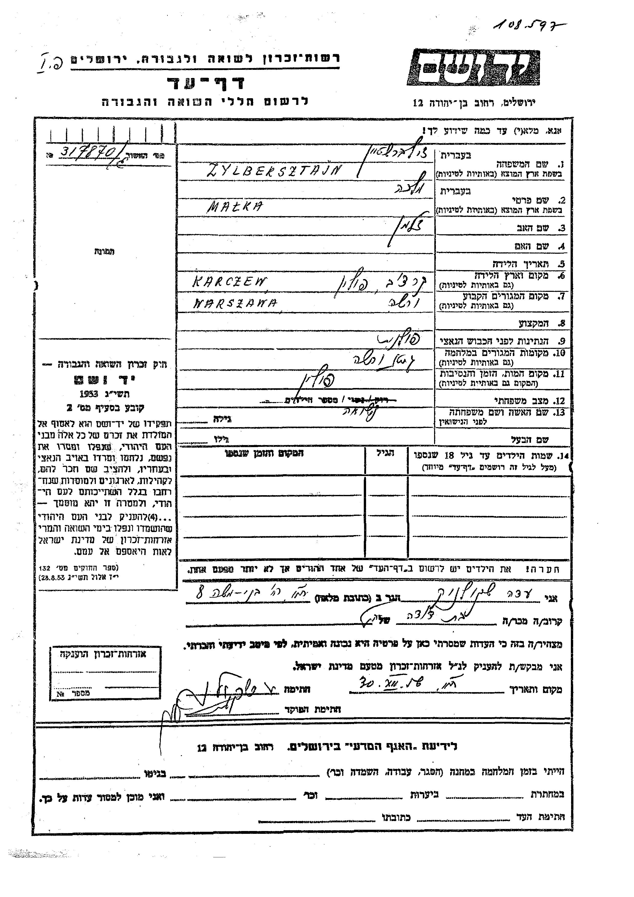 Zylbersztajn Malka Warszawa, Pologne Feuille de témoignage