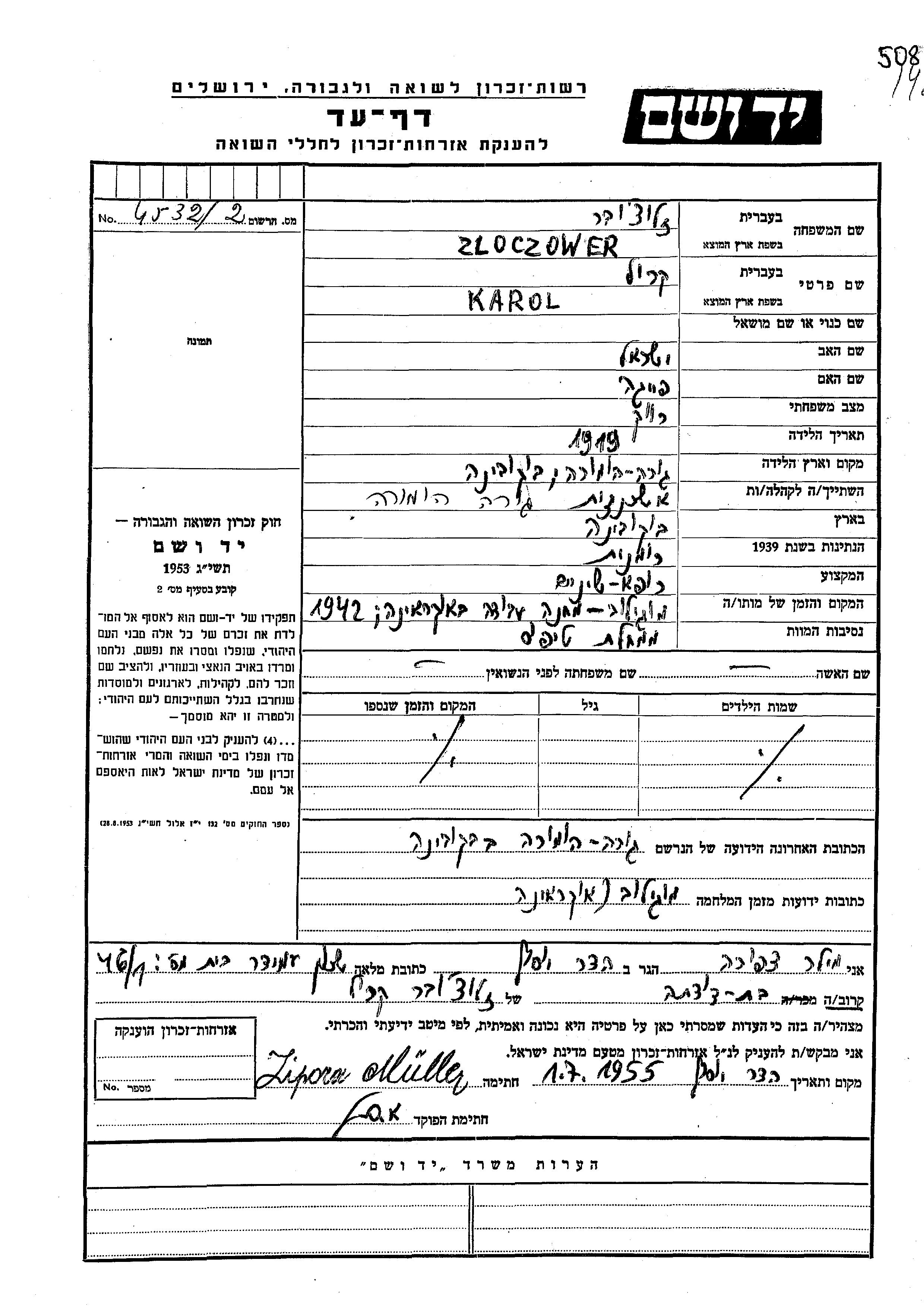 Karol Zloczower est né à Gora Humora, Roumanie en 1919, fils de Yisrael et de Feiga. Il était Dentiste et Célibataire. Avant la seconde guerre mondiale il vivait à Gora Humora, Roumanie. Au cours de la guerre, il était à Mogilev Podolski, Ukraine (URSS).
