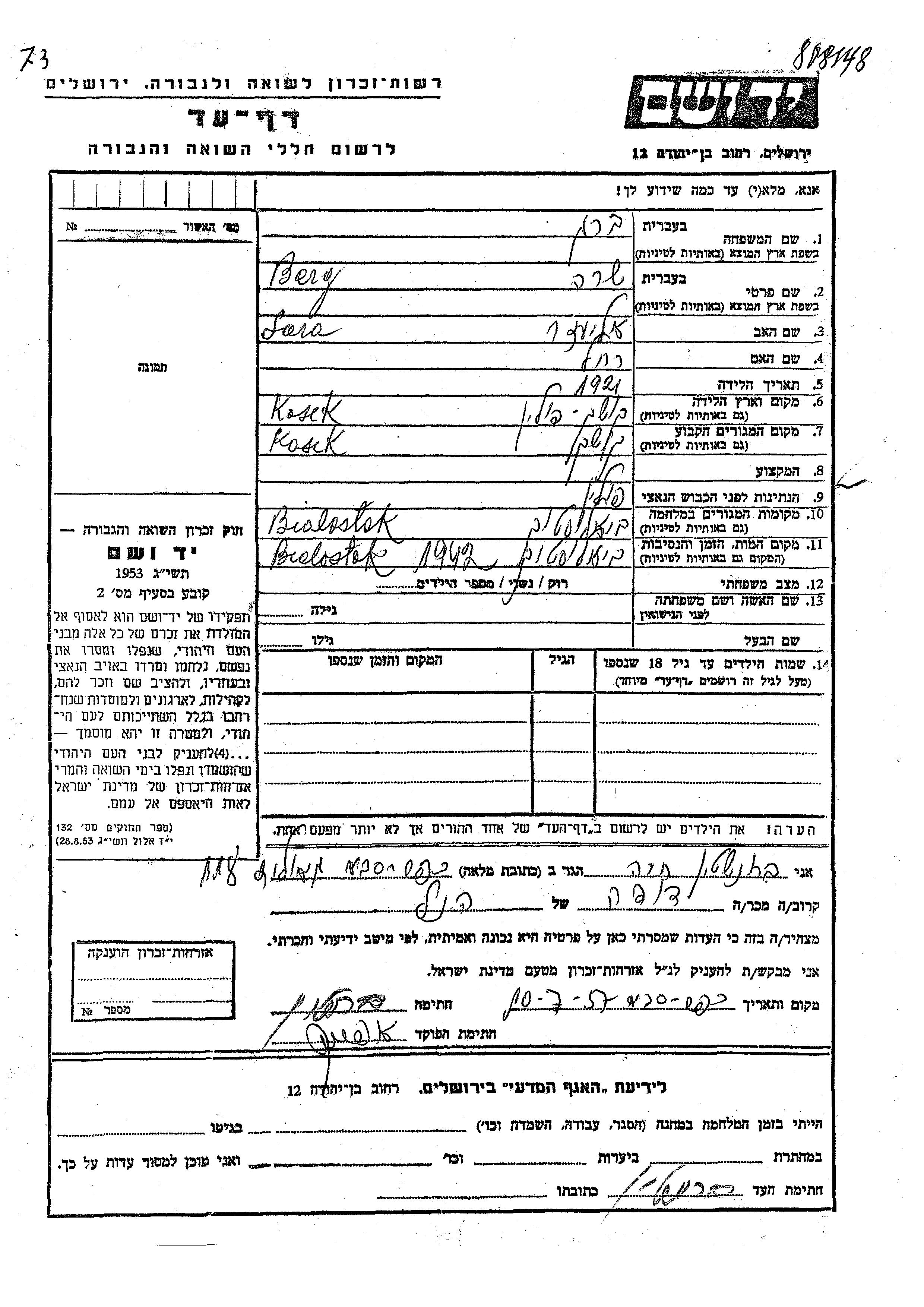 Sara Berg est née à Kossaki, Pologne en 1921, fille de Eliezer et de Rakhel. Avant la seconde guerre mondiale elle vivait à Kossaki, Pologne. Pendant la guerre, elle était à Bialystok, Pologne.