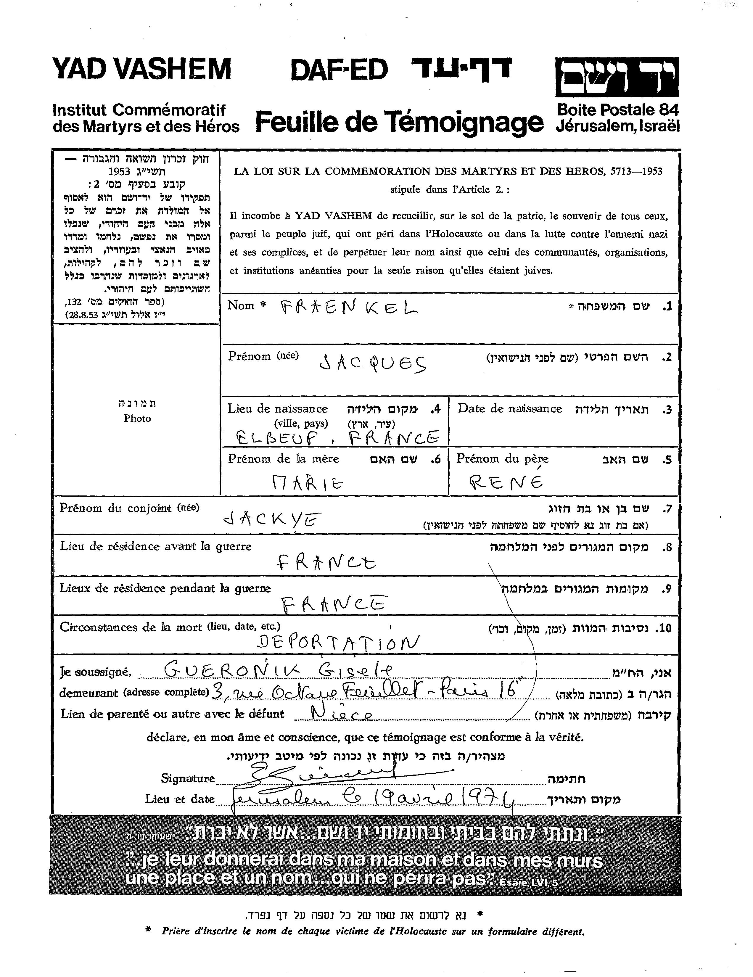 Jacques Fraenkel est né à Elbeuf, France, fils de Rene et de Marie. Il était Mariée à Jackye. Avant la seconde guerre mondiale il vivait à France. Au cours de la guerre, il était à France.