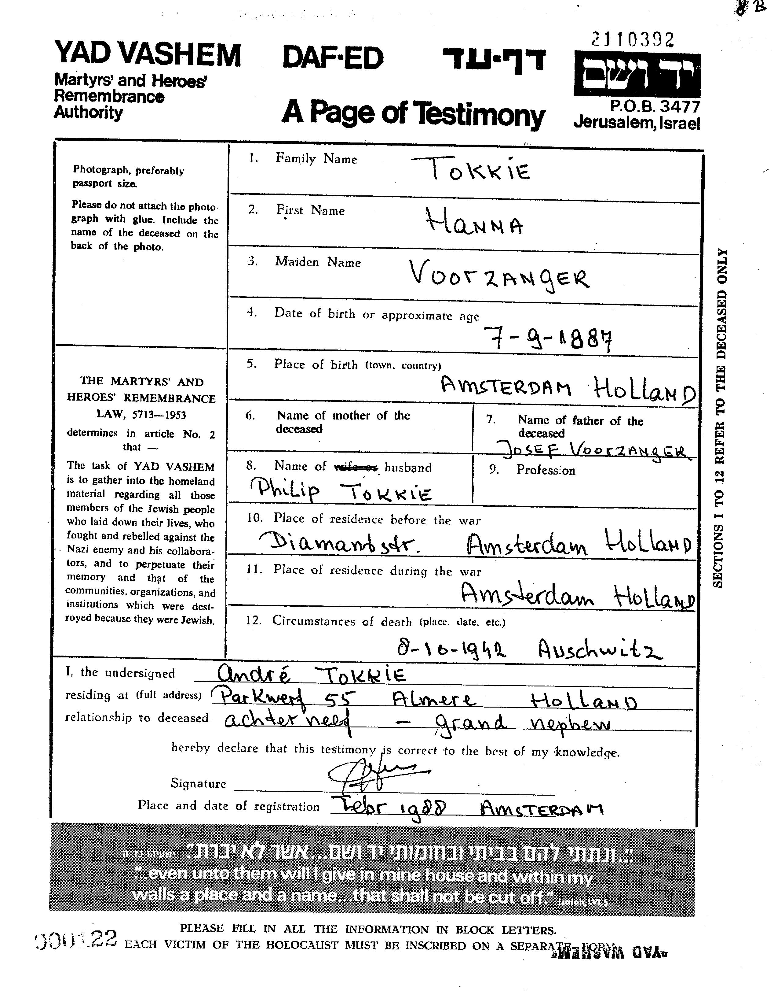 Hanna Tokkie née Voorzanger Vorzanger est née à Amsterdam, Pays-Bas en 1887, fille de Josef. Elle était Mariée à Philip. Avant la seconde guerre mondiale elle vivait à Amsterdam, Pays-Bas. Pendant la guerre, elle était à Amsterdam, Pays-Bas.