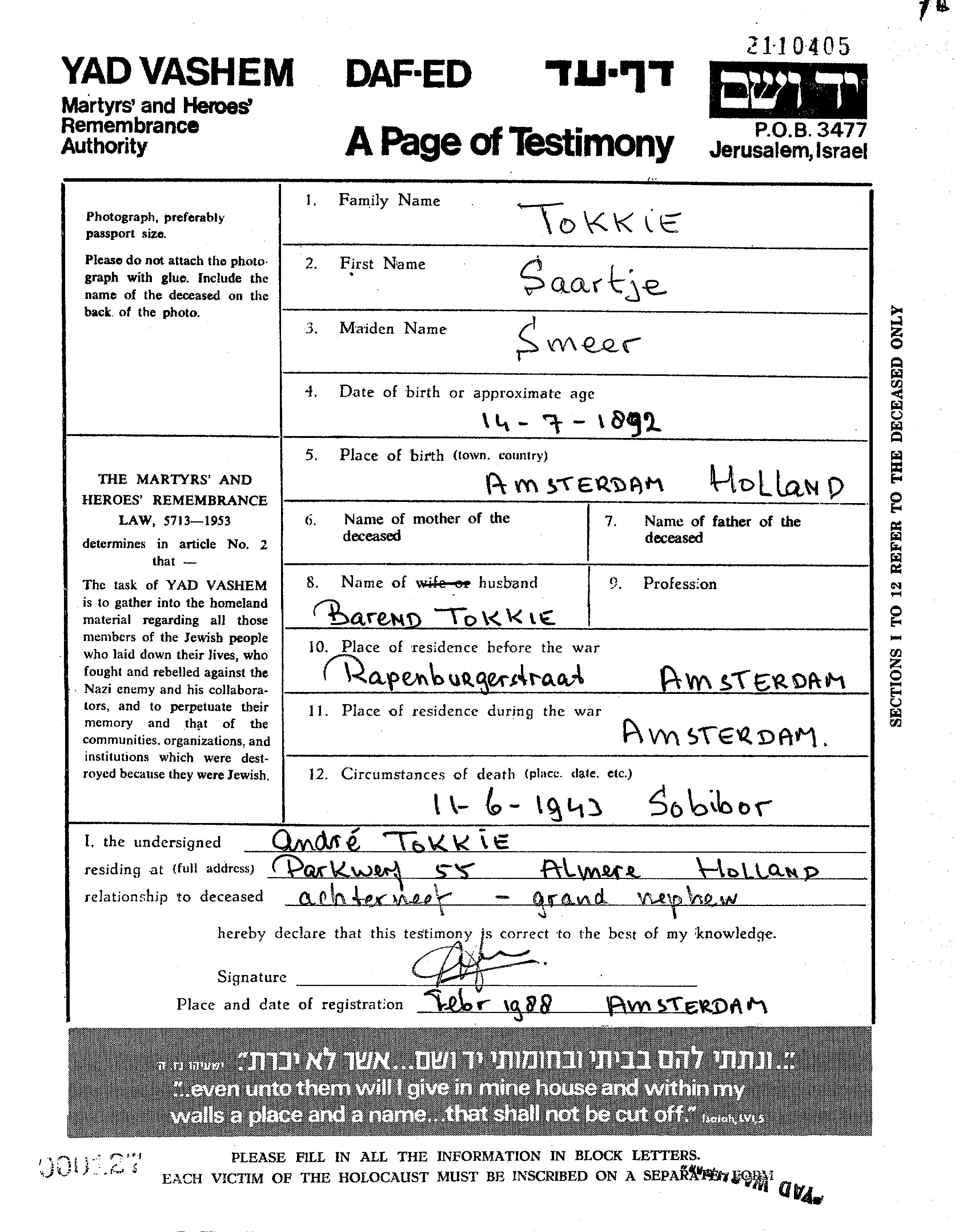 Saartje Tokkie née Smeer est née à Amsterdam, Pays-Bas en 1892. Elle était Mariée à Barend. Avant la seconde guerre mondiale elle vivait à Amsterdam, Pays-Bas. Pendant la guerre, elle était à Amsterdam, Pays-Bas.