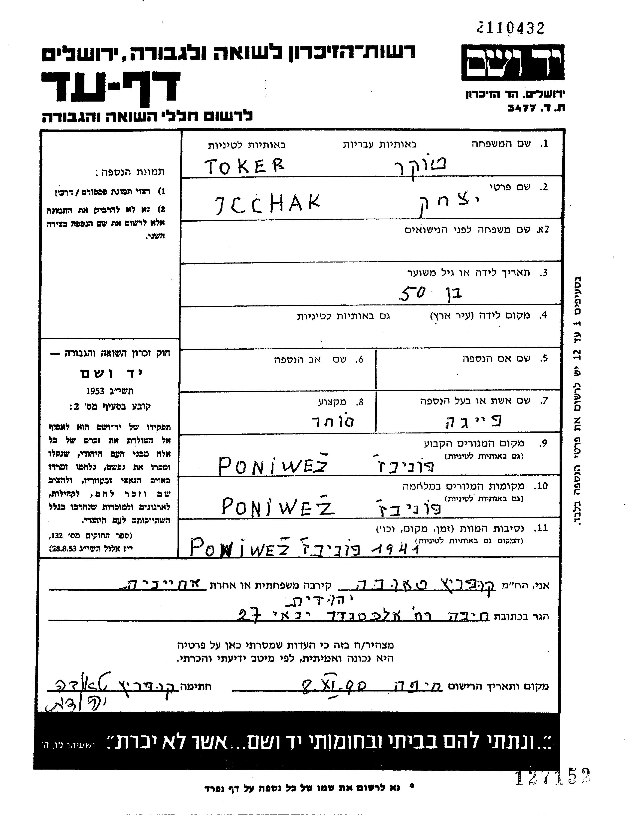 Toker Icchak 1891 Ponivez, Lituanie Feuille de témoignage