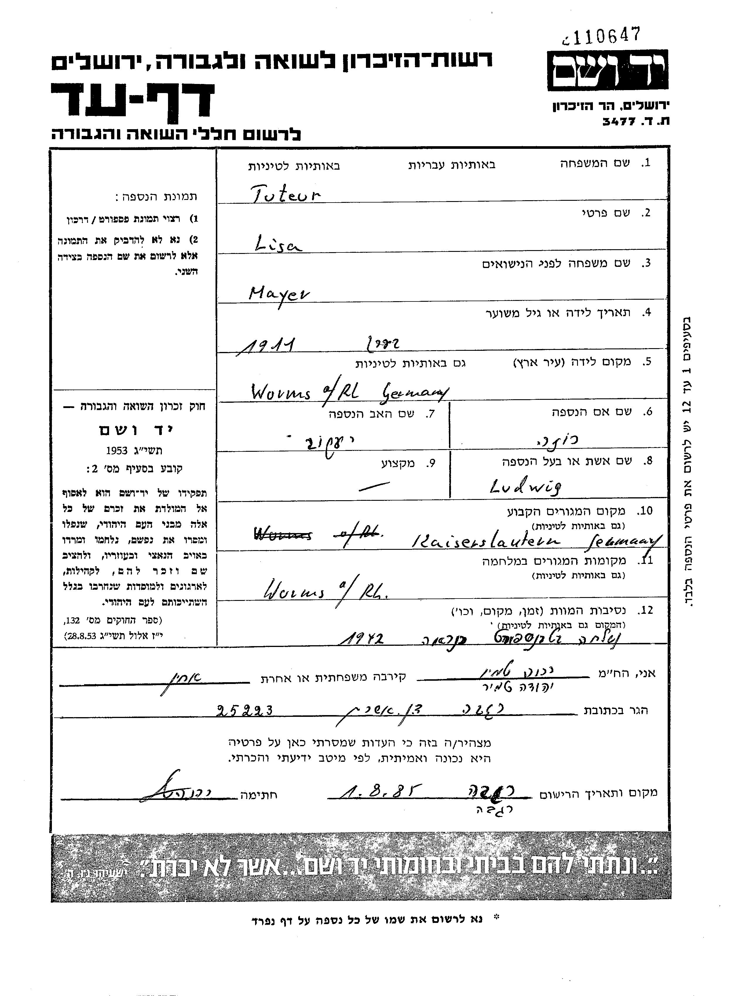 Lisa Tuteur née Mayer est née à Worms, Allemagne en 1911, fille de Yakov et de Roza. Elle était Mariée à Ludwig. Avant la seconde guerre mondiale elle vivait à Kaiserslautern, Allemagne. Pendant la guerre, elle était à Allemagne.