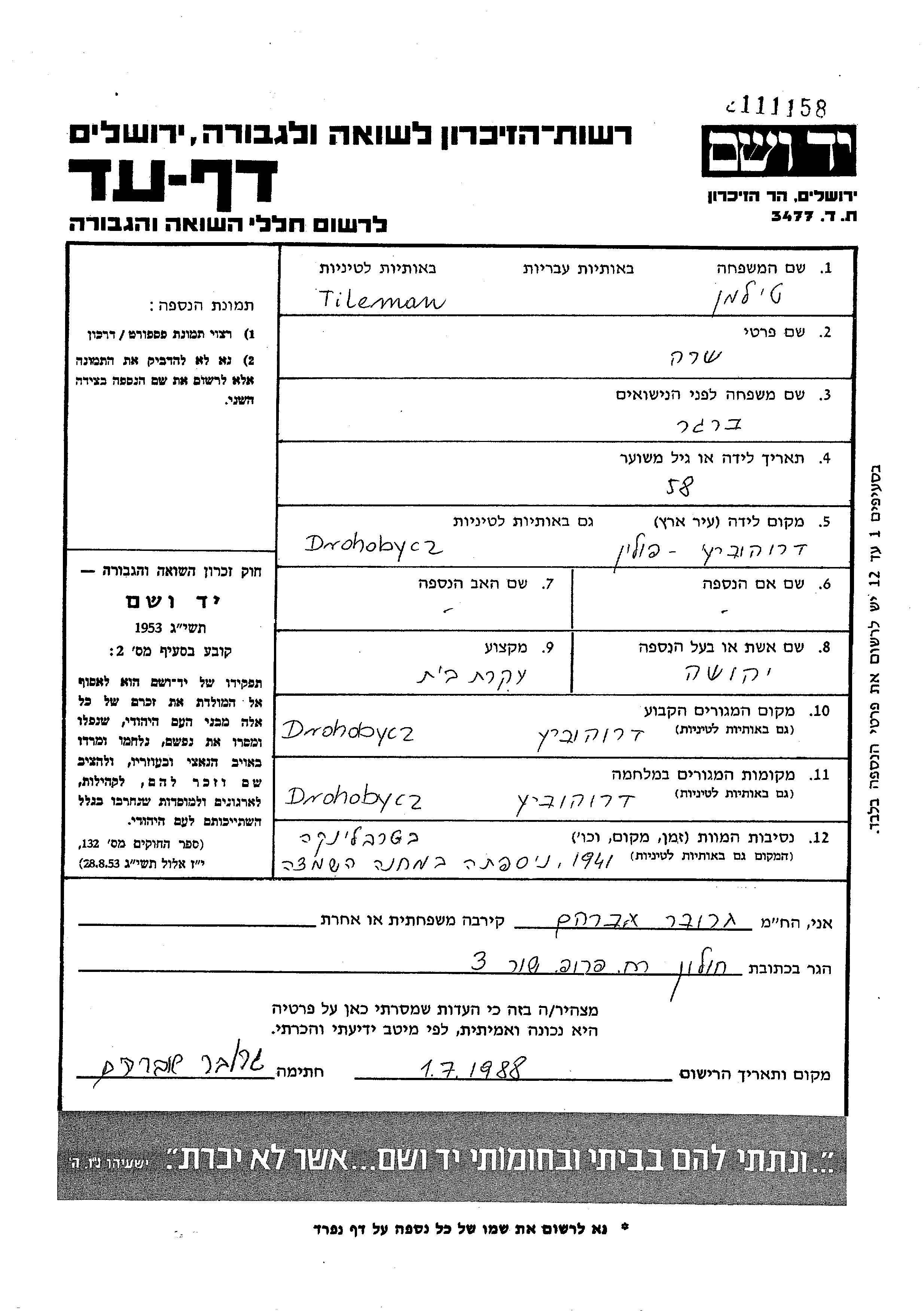 Sara Tileman née Berger est née à Drohobycz, Pologne en 1883. Elle était Femme au foyer et Mariée à Yehoshua. Avant la seconde guerre mondiale elle vivait à Drohobycz, Pologne. Pendant la guerre, elle était à Drohobycz, Pologne.