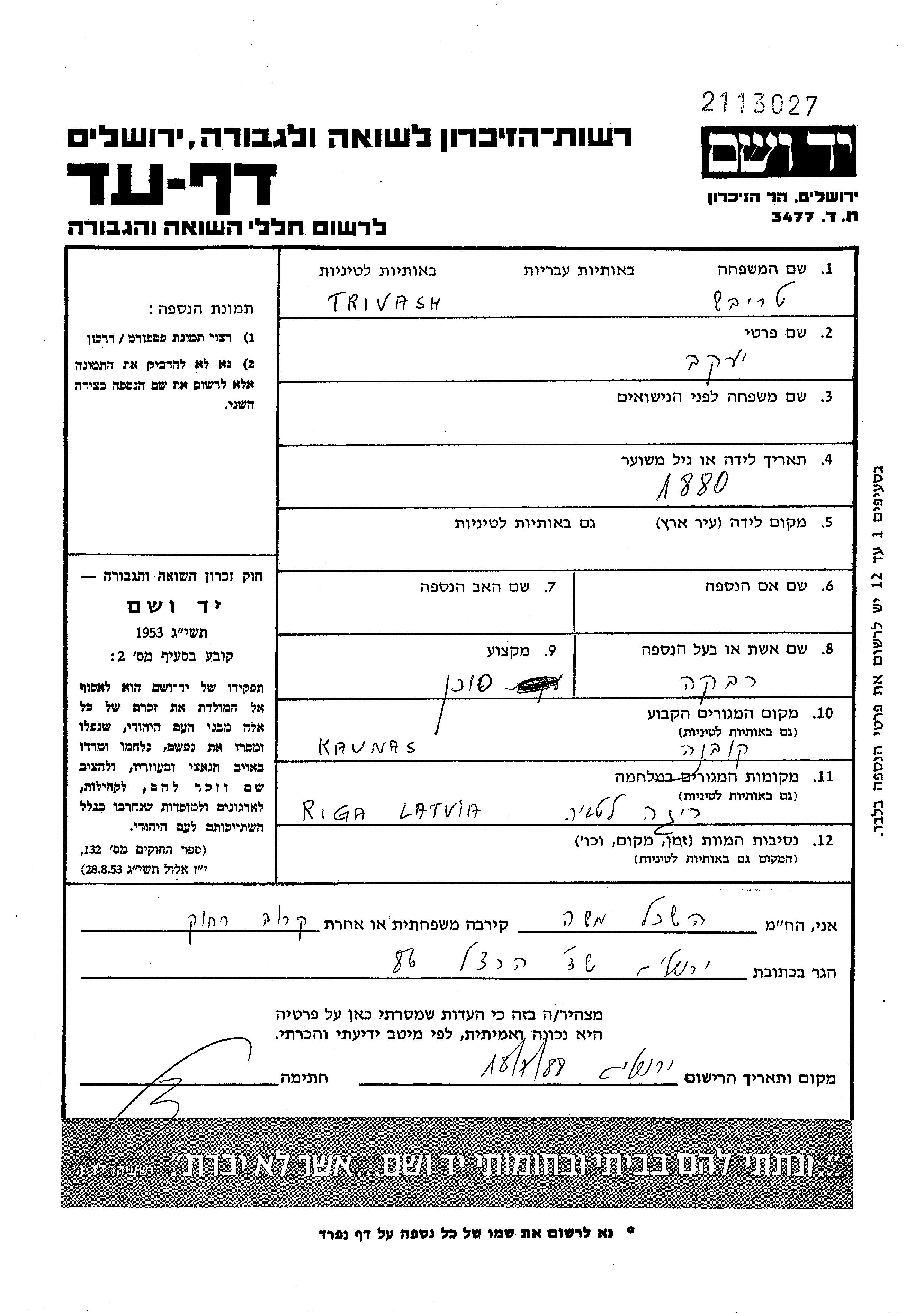 Yaakov Trivash Tribash est né en 1880. Il était Agent/e et Mariée à Rivka. Avant la seconde guerre mondiale il vivait à Kowno, Lituanie. Au cours de la guerre, il était à Riga, Lettonie.