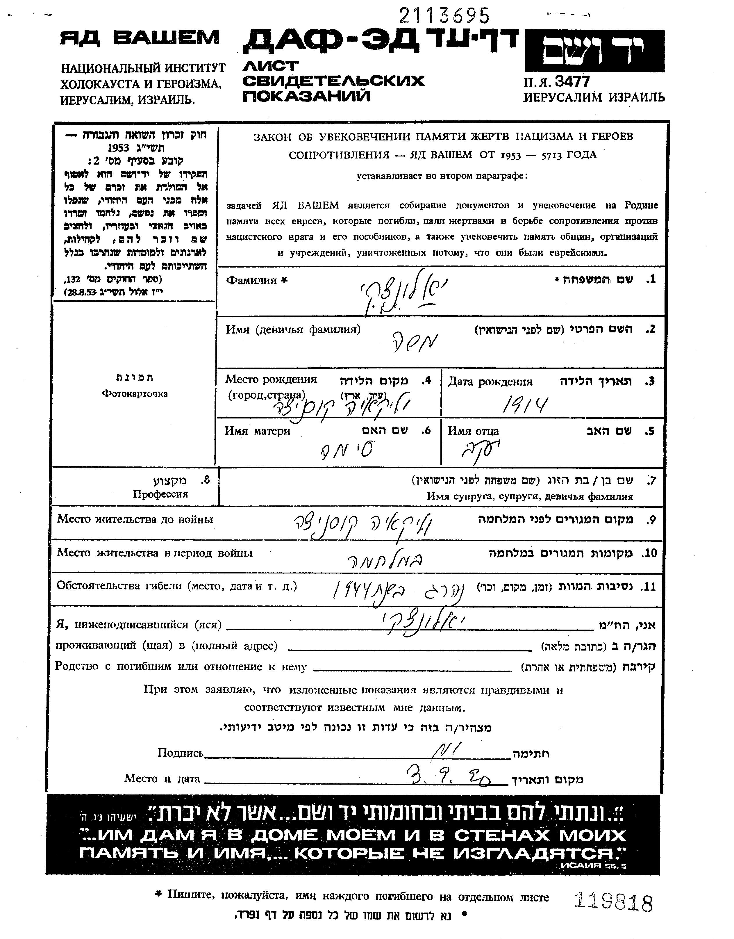 Ialonetzki Moshe 1914 Velikaya Kosnitsa, Ukraine (URSS) Feuille de témoignage
