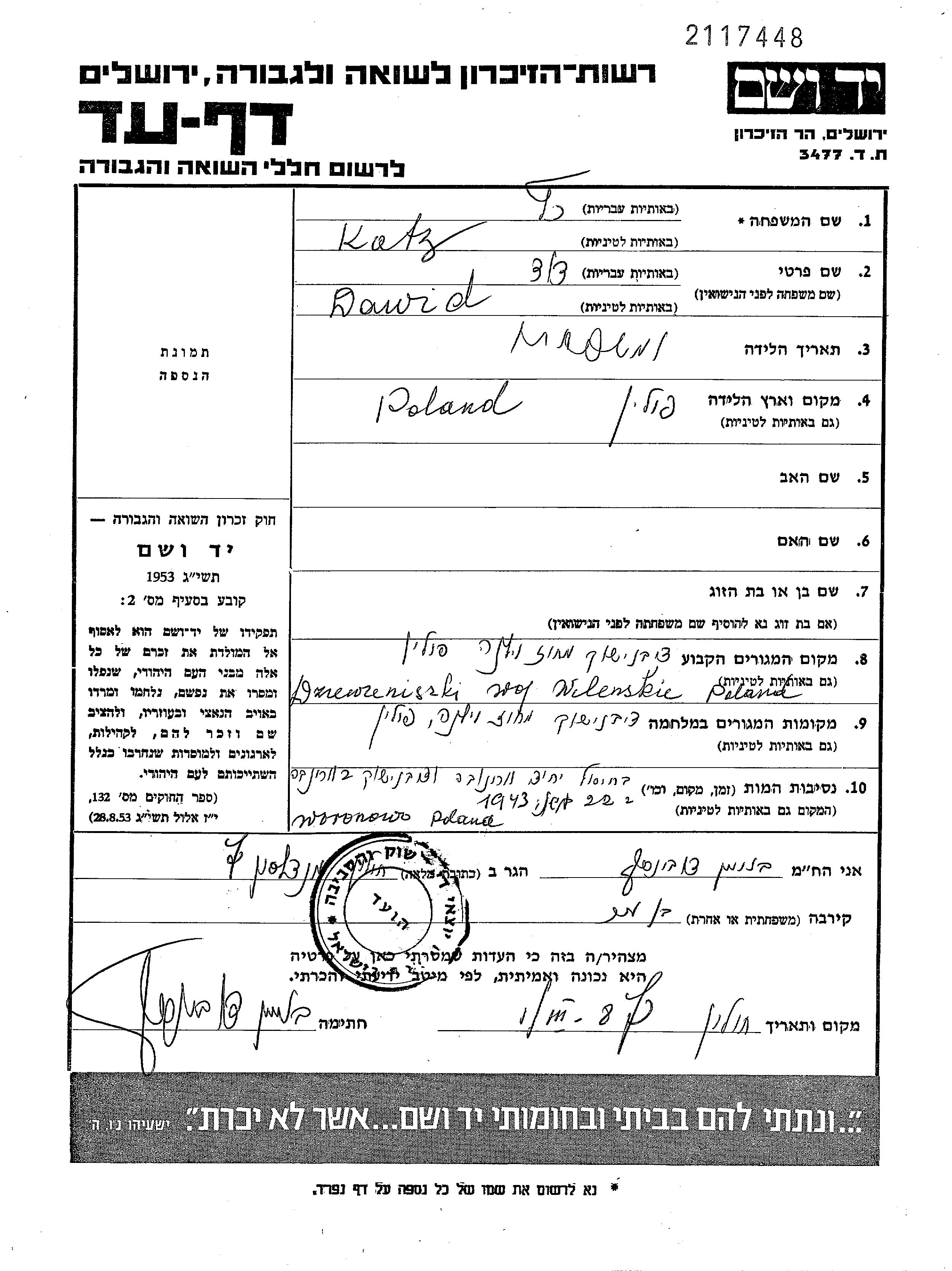 Katz Dawid Dziewieniszki, Pologne Feuille de témoignage