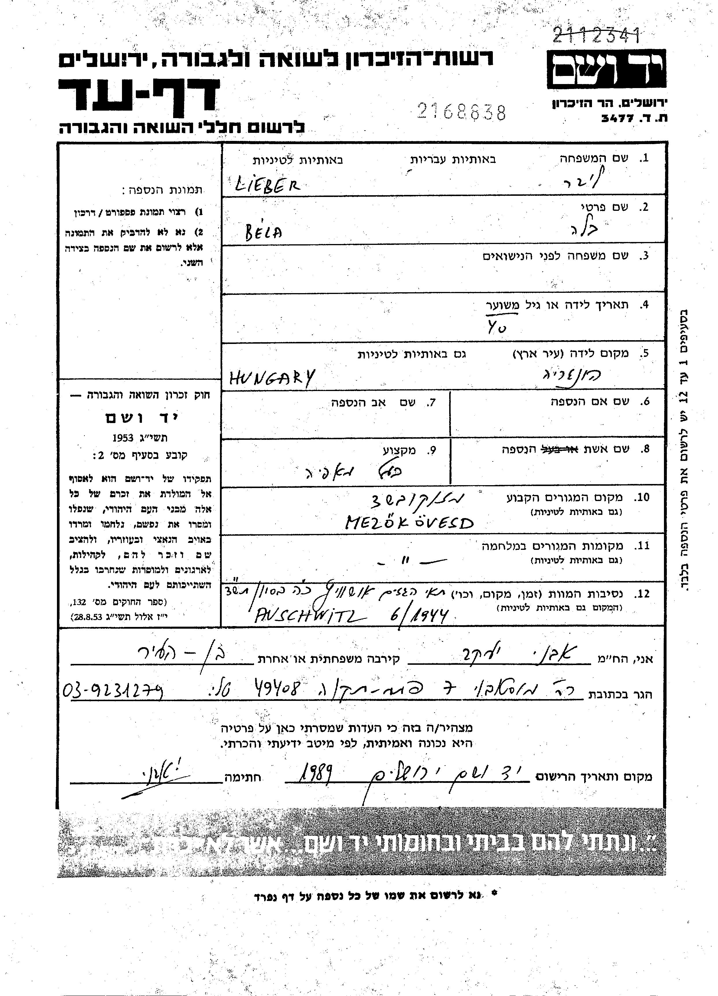 Bela a été assassiné pendant la Shoah. Lieu de la mort: Auschwitz, Pologne en 1944.