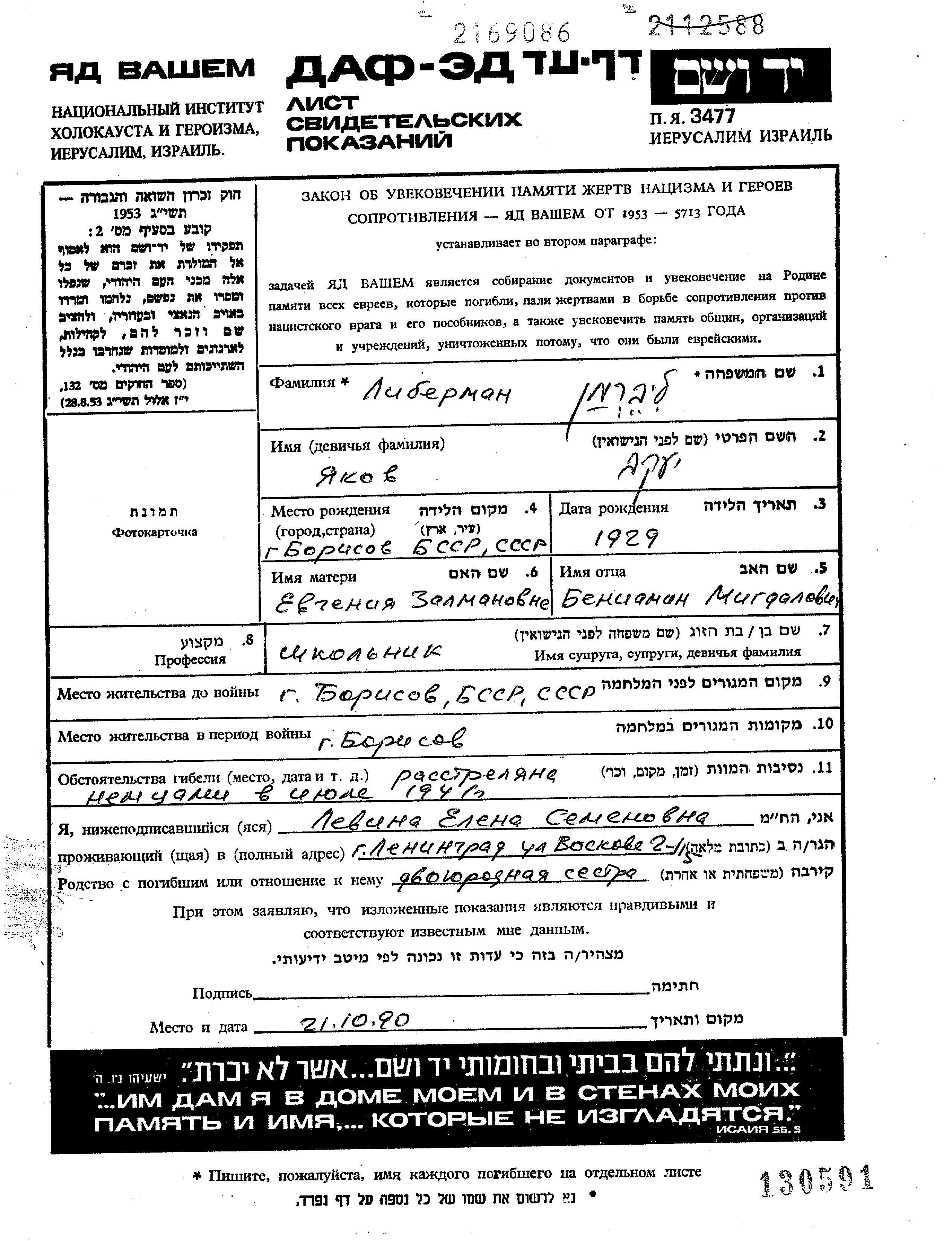 Liberman Yakov 1929 Borisov, Bélorussie (URSS) Feuille de témoignage