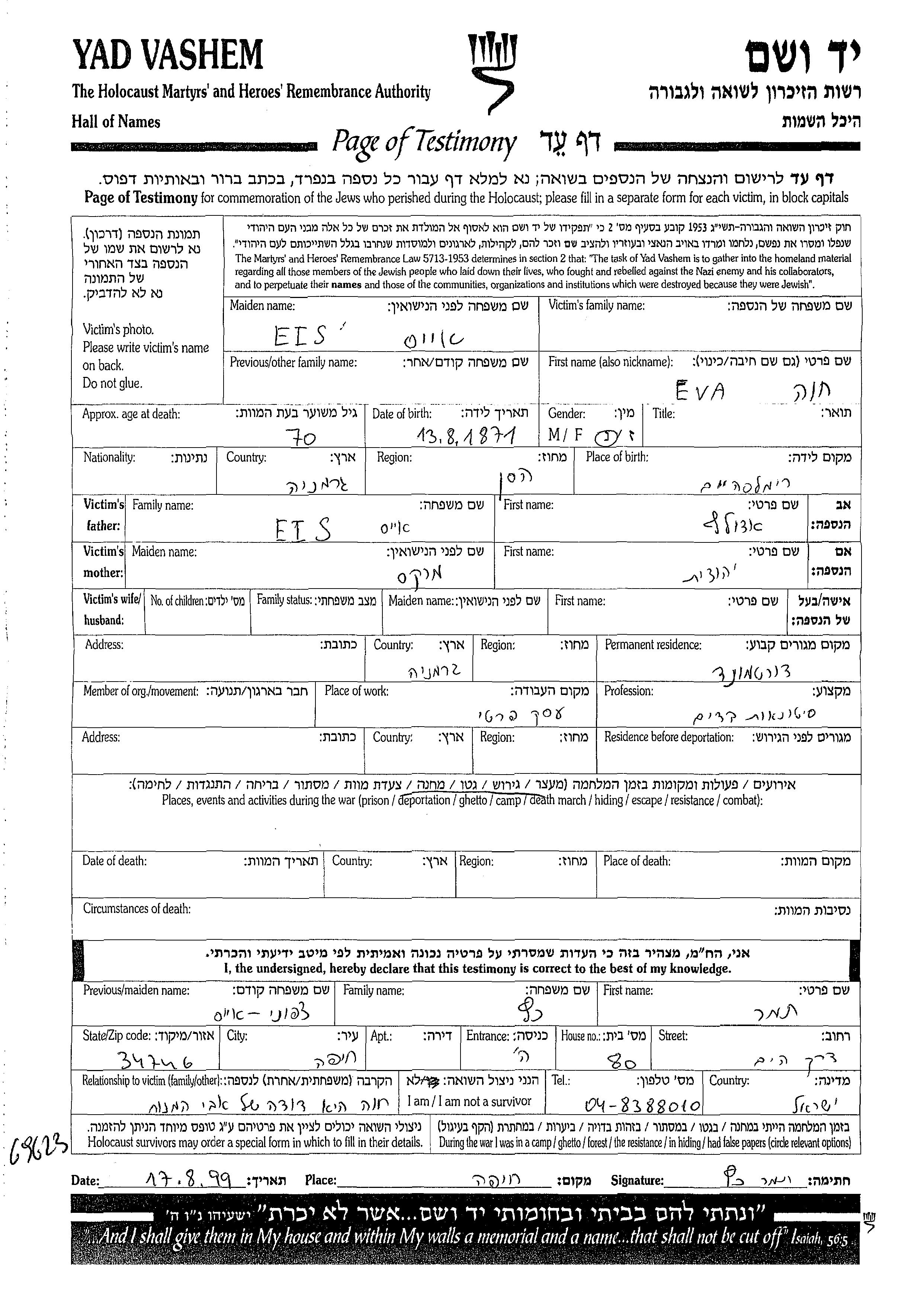 Yad Vashem - Pages of Testimony Names Memorial Collection