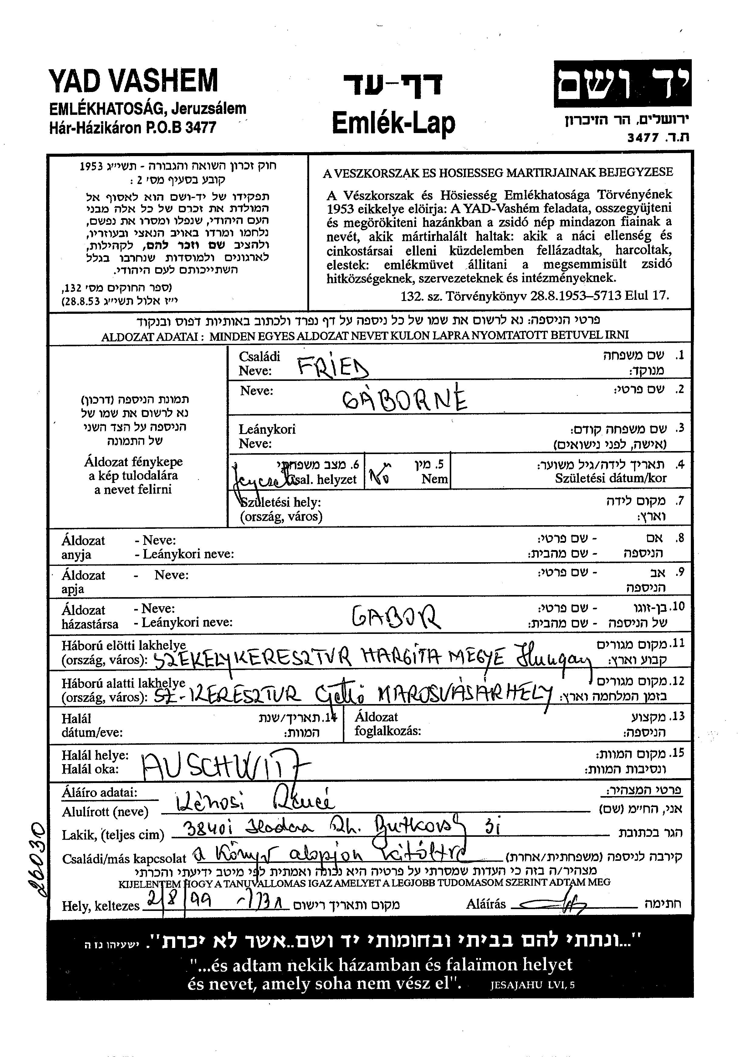 prénom inconnu Fried. Elle était Mariée à Gabor. Avant la seconde guerre mondiale elle vivait à Szekelykeresztur, Roumanie. Pendant la guerre, elle était à Szekelykeresztur, Roumanie.