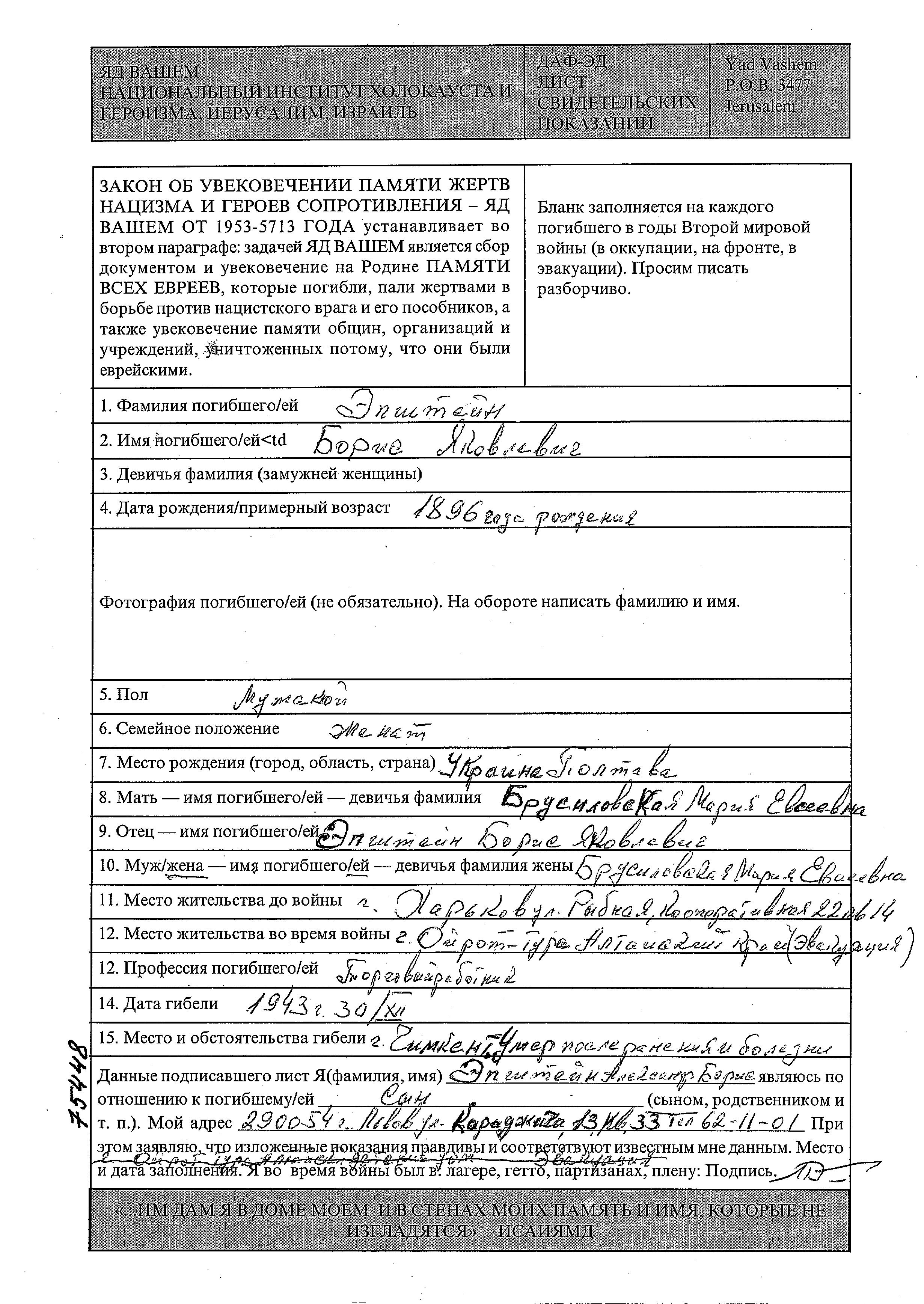Boris Epshtein est né à Poltava, Ukraine (URSS) en 1896, fils de Yakov. Il était Vendeur et Mariée à Mariya née Brusilovskaya. Avant la seconde guerre mondiale il vivait à Kharkov, Ukraine (URSS). Au cours de la guerre, il était à the Soviet armed forces. Boris a été tué en tant que militaire pendant la Seconde Guerre mondiale. Lieu de la mort: Chimkent, Ouzbékistan (URSS) en 1943.
