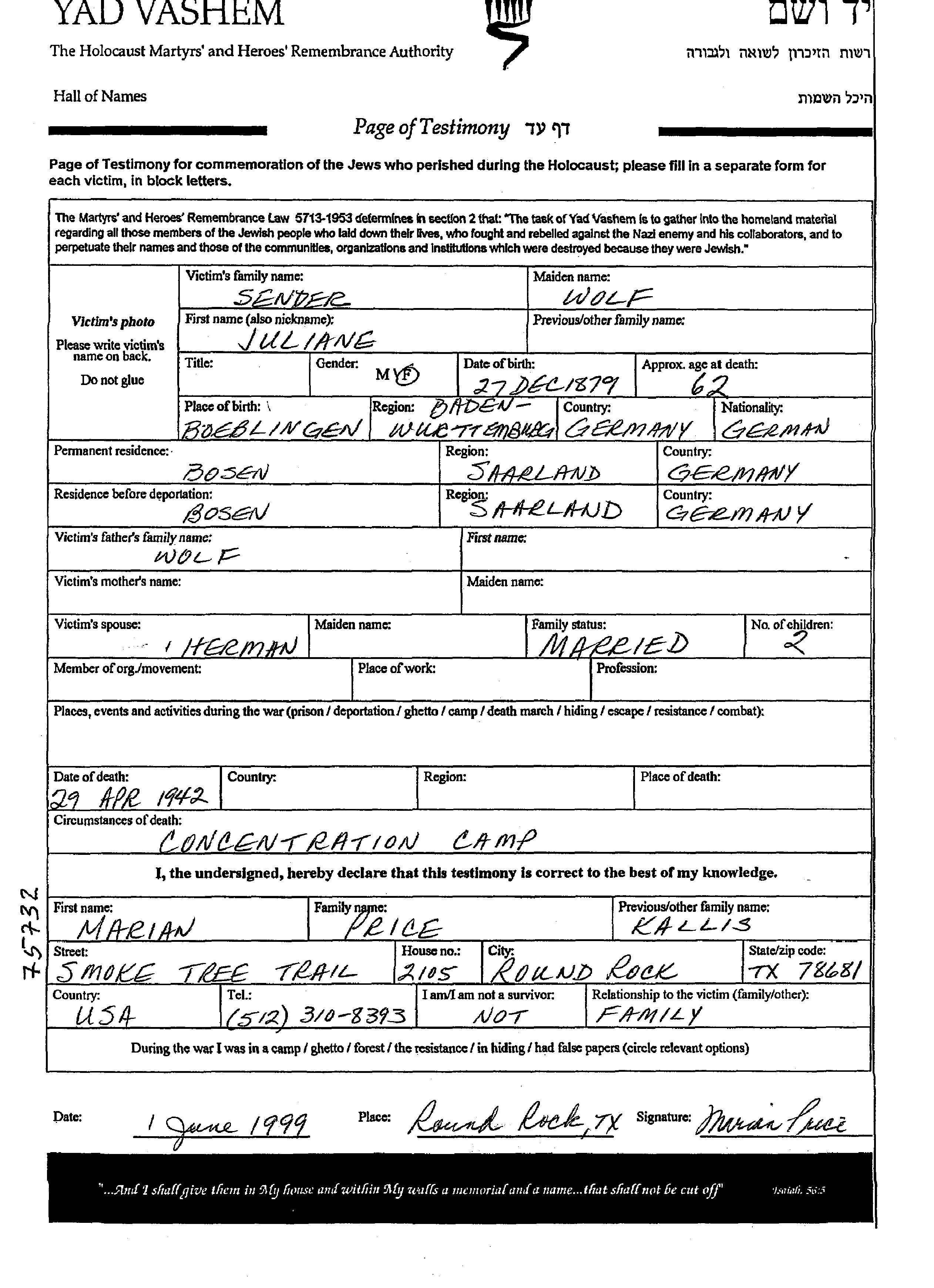 Yad Vashem - Pages of Testimony Names Memorial Collection