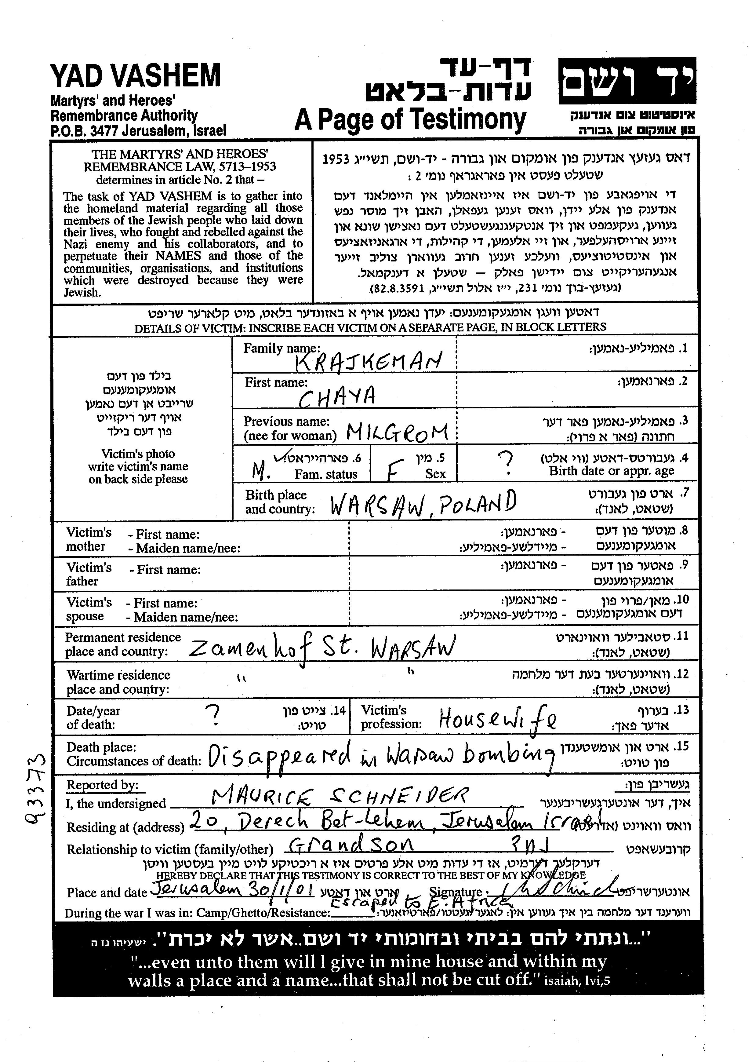 Krajkeman Chaya Varsha, Pologne Feuille de témoignage