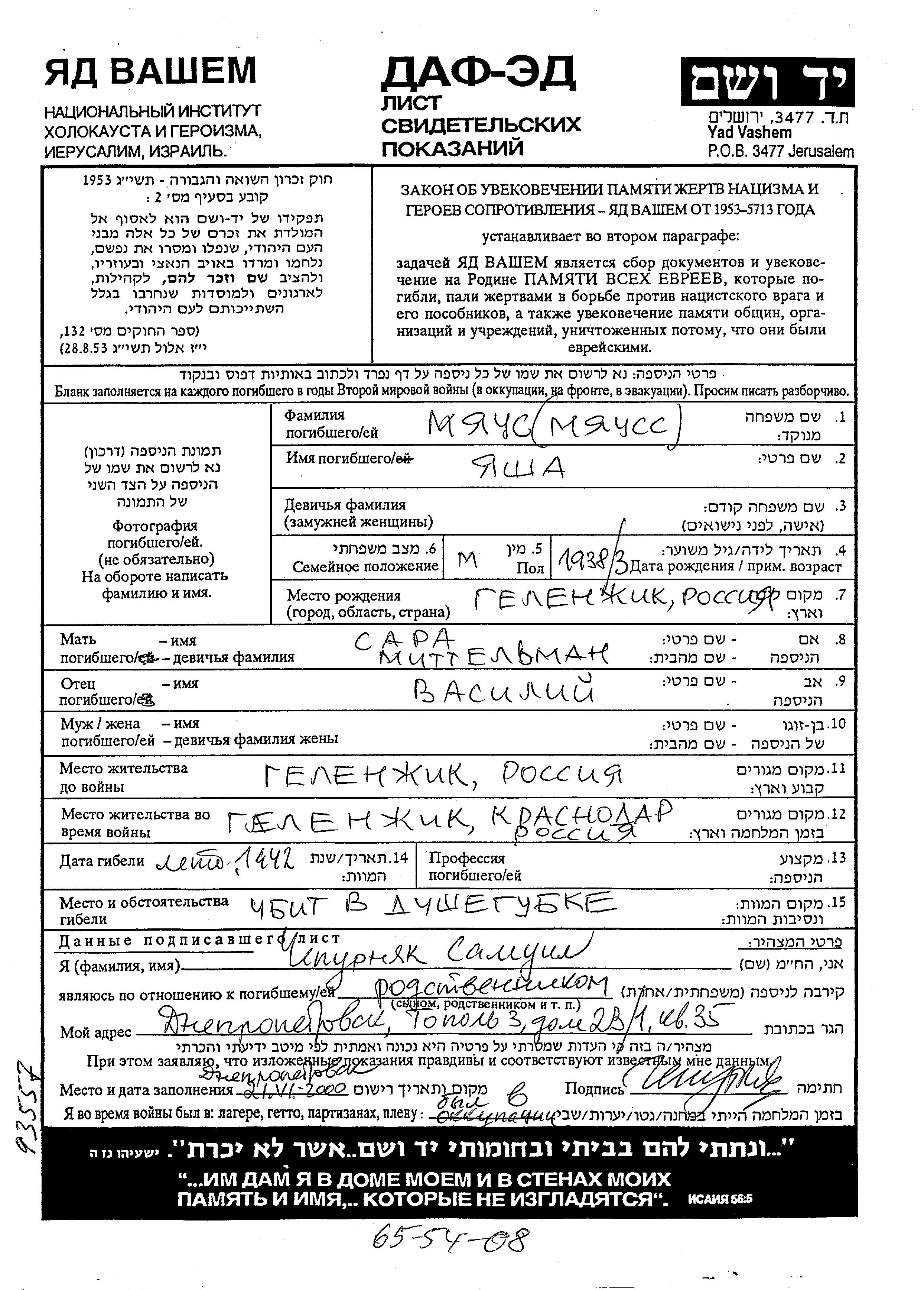 Yasha a été assassiné pendant la Shoah. Lieu de la mort: Gelendzhik, Russie (URSS) en 1942.