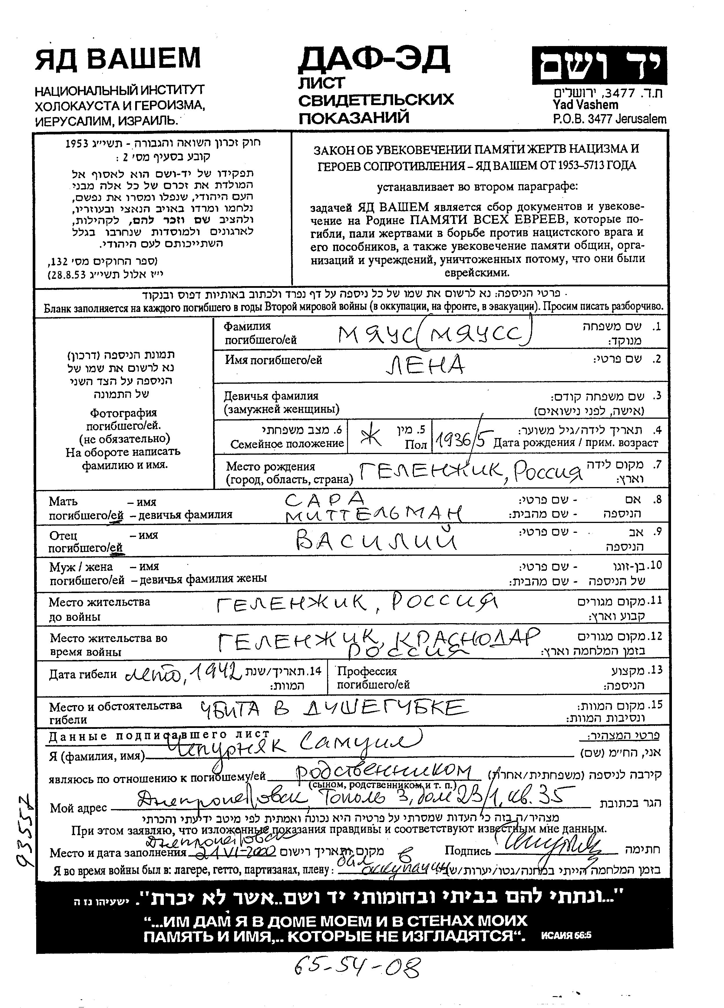 Yad Vashem - Pages of Testimony Names Memorial Collection