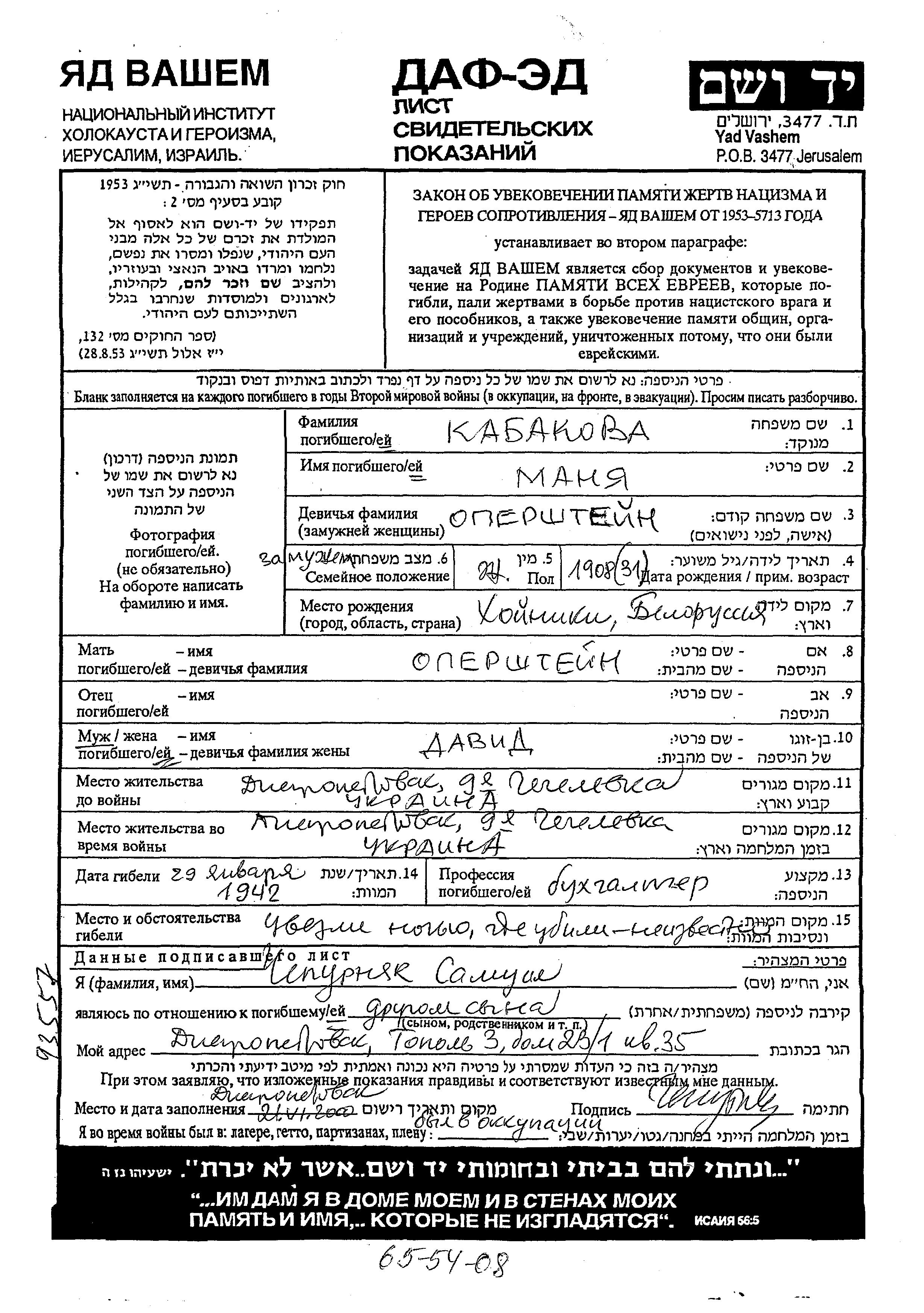 Kabakova Manya 1908 Dnepropetrovsk, Ukraine (URSS) Feuille de témoignage